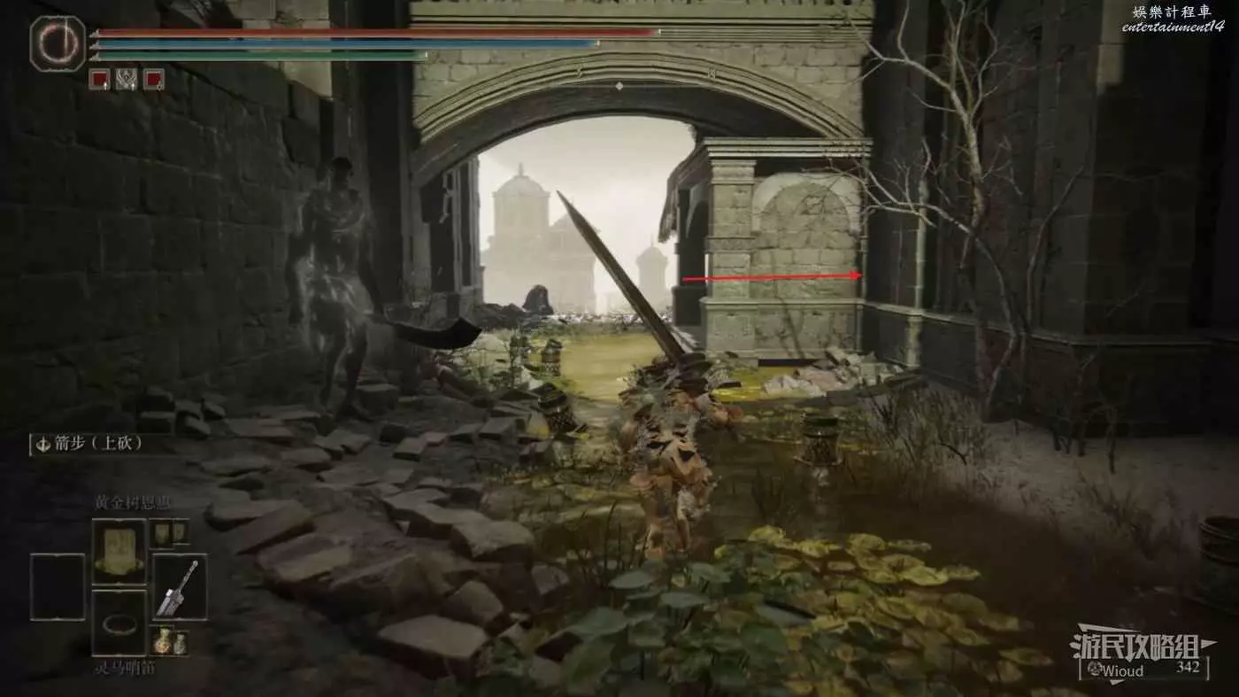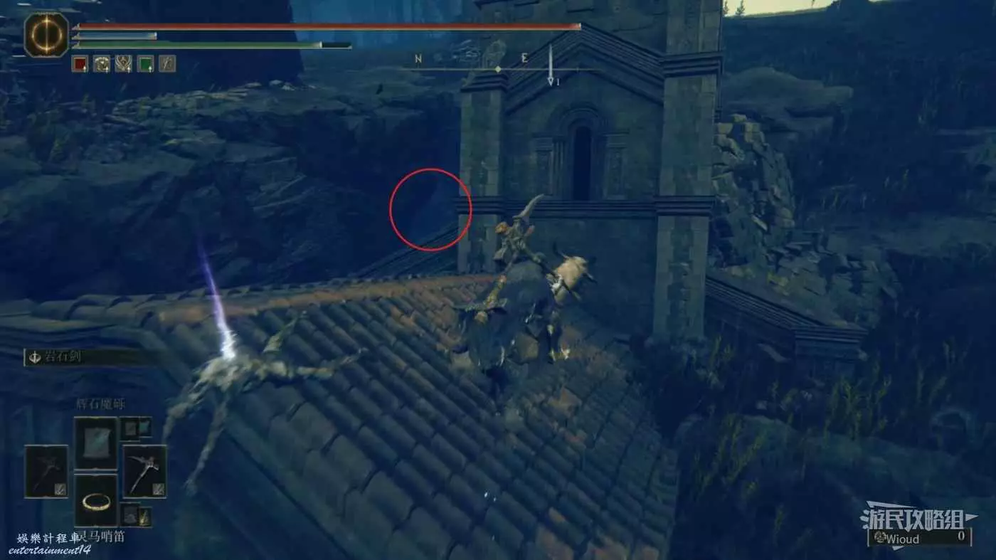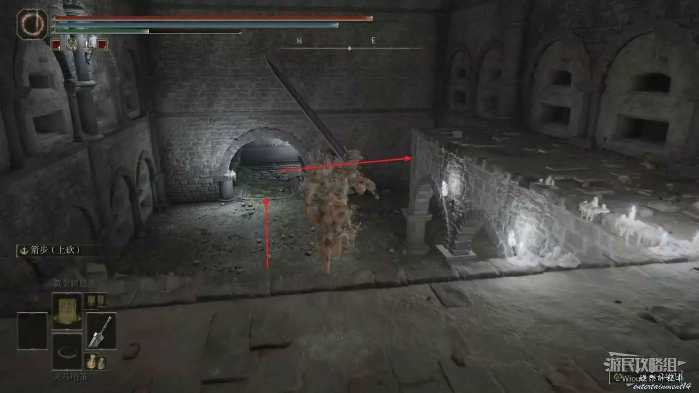 此時往左邊走,直接跳到右前方坍塌房屋的上面,可以直接看到右下方有一個房間的入口。