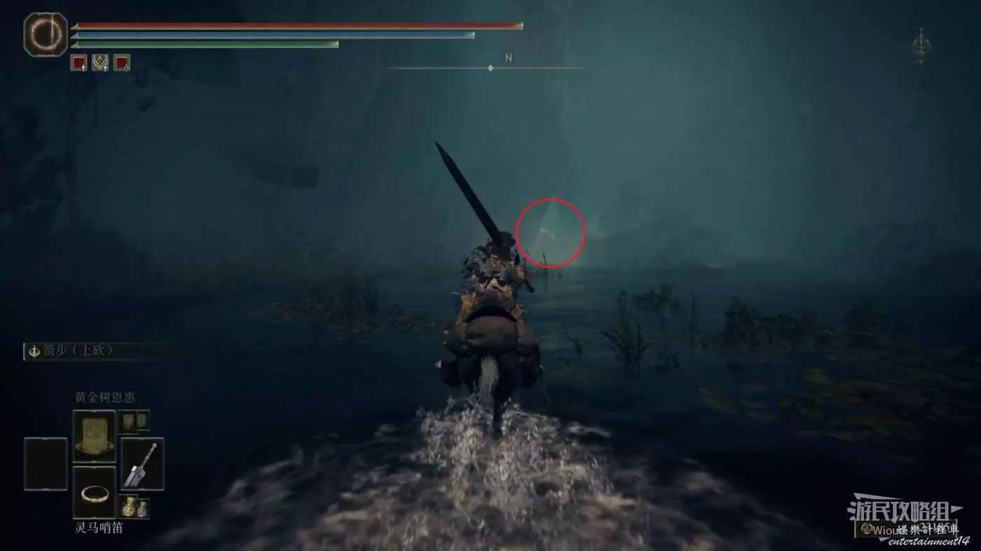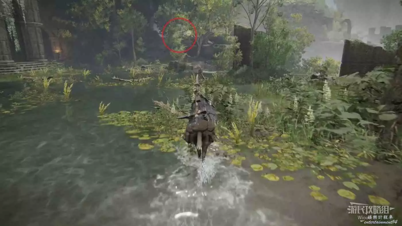 然後往前方右側走,騎馬跳到樹上拾取樹上的光點可以獲得【熔爐薄翼護符】。