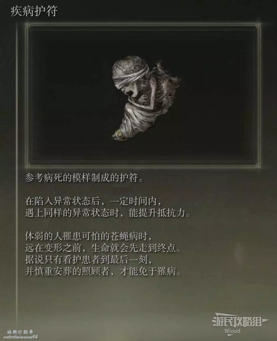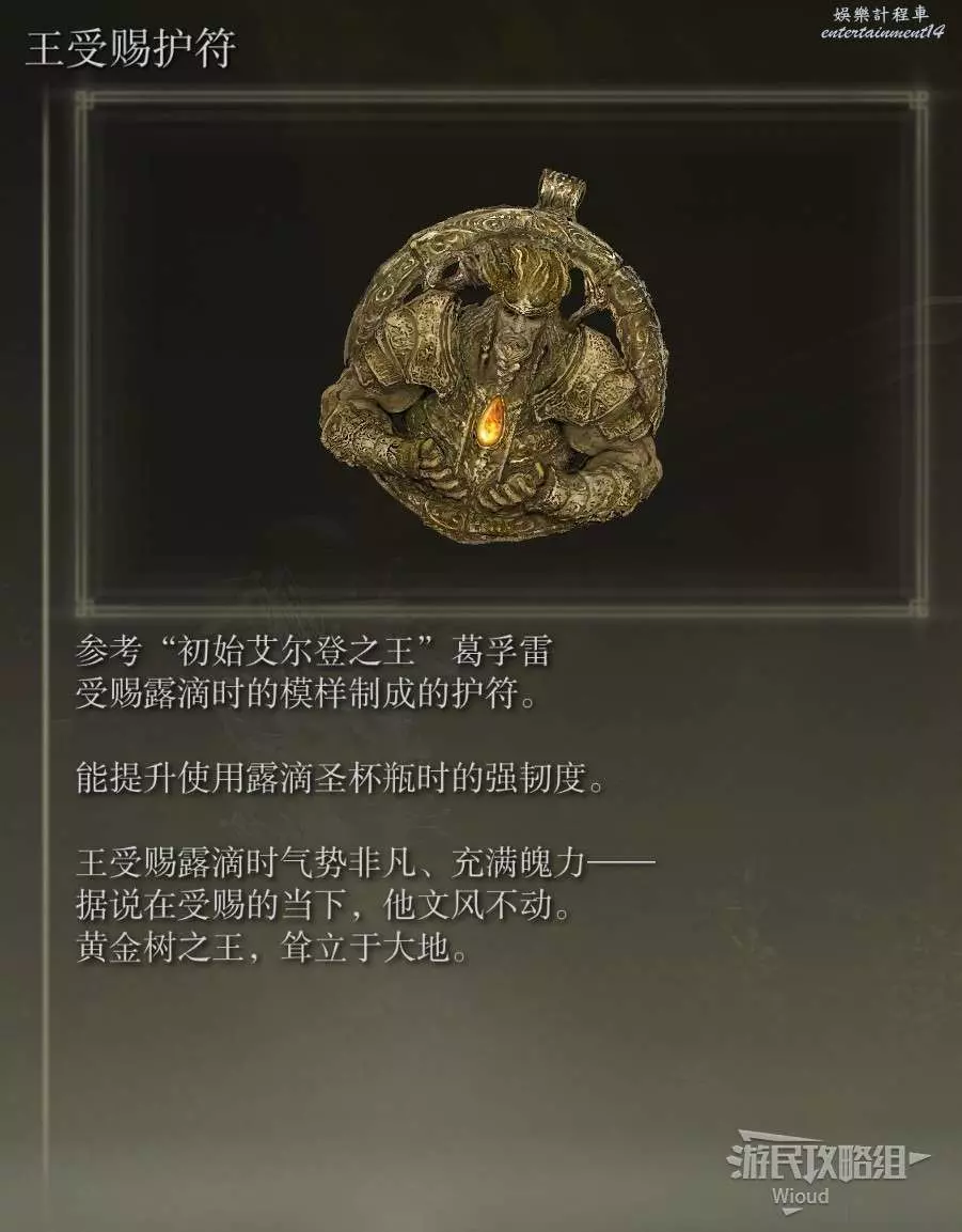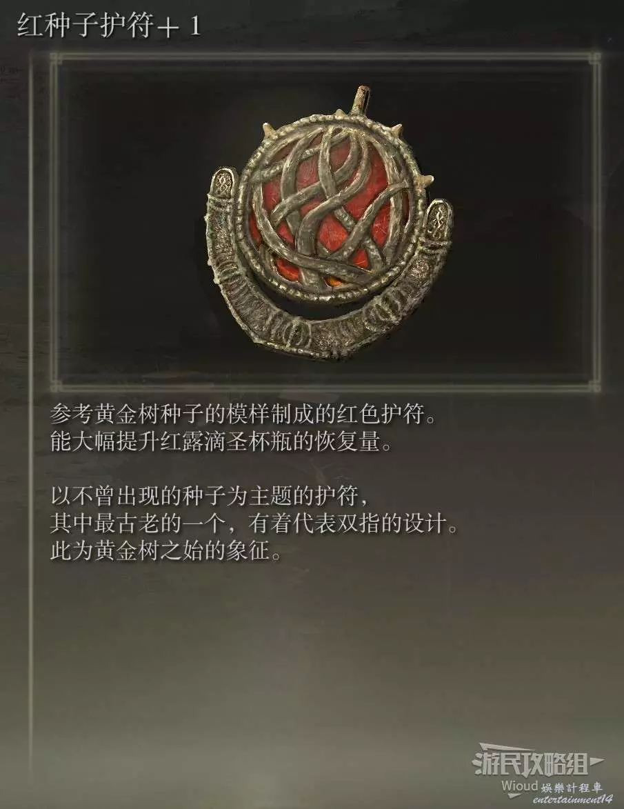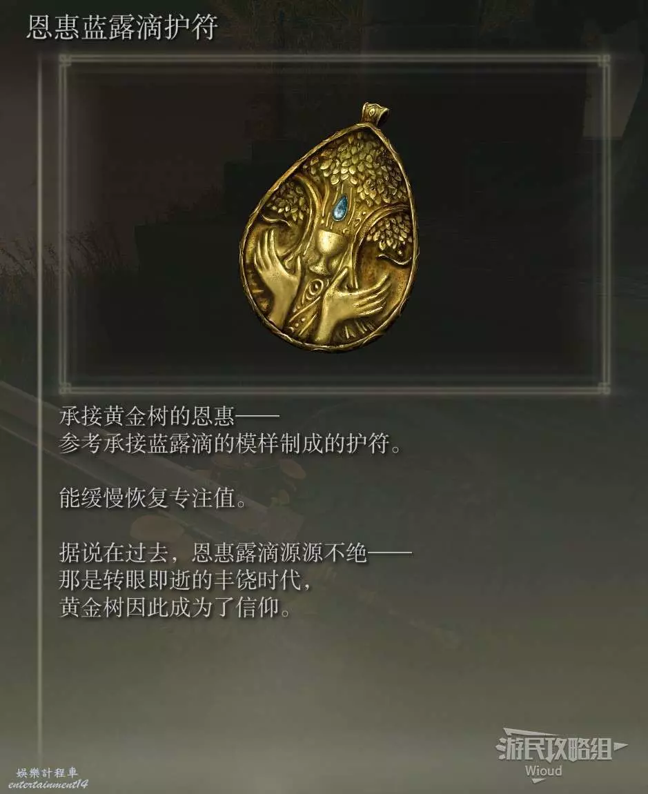 此護符位於【勞弗斯遺跡】賜福附近的【神殿鎮廢墟】頂層寶箱中。
