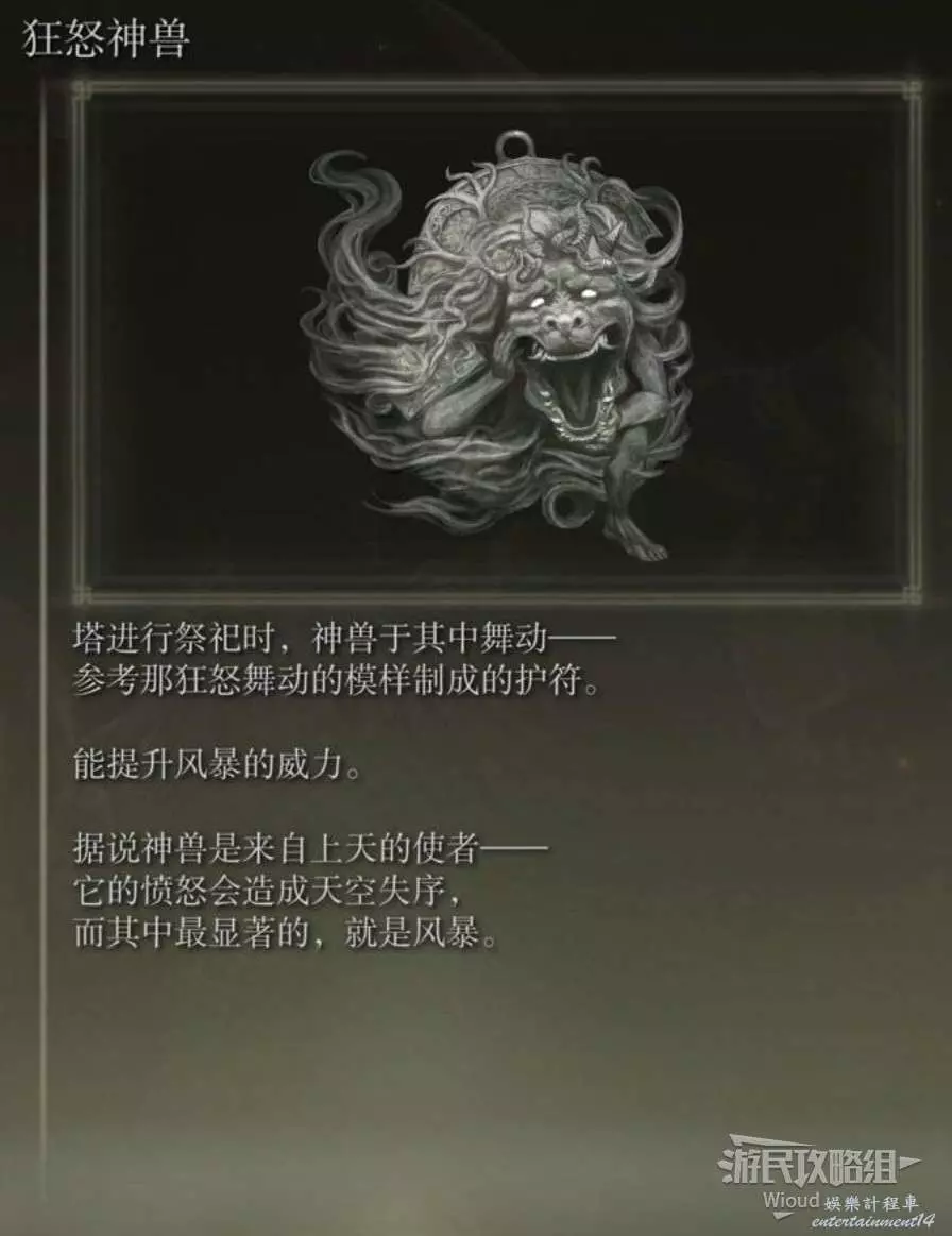 此護符需要擊敗“塔之鎮”貝瑞特的最終BOSS神獸舞獅,並使用追憶兌換獲得。