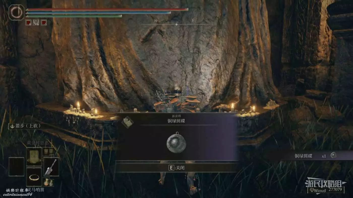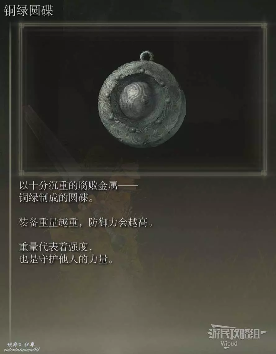 此時往左前方走不了多遠就能到達盡頭的雕像位置,拾取雕像前的光點獲得護符【銅綠圓碟】。