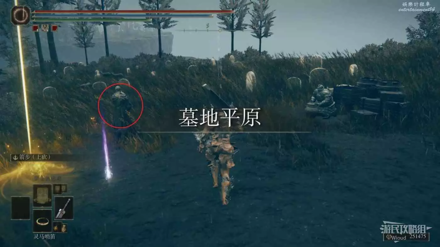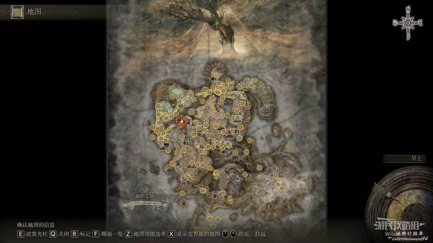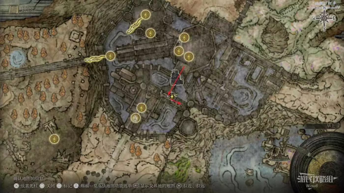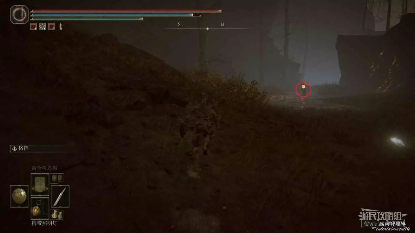 首先從賜福【正門前的十字記號】出發,往左下繞到眺望鎮,從眺望鎮繼續往下走經過一片有黃色閃電的森林。
