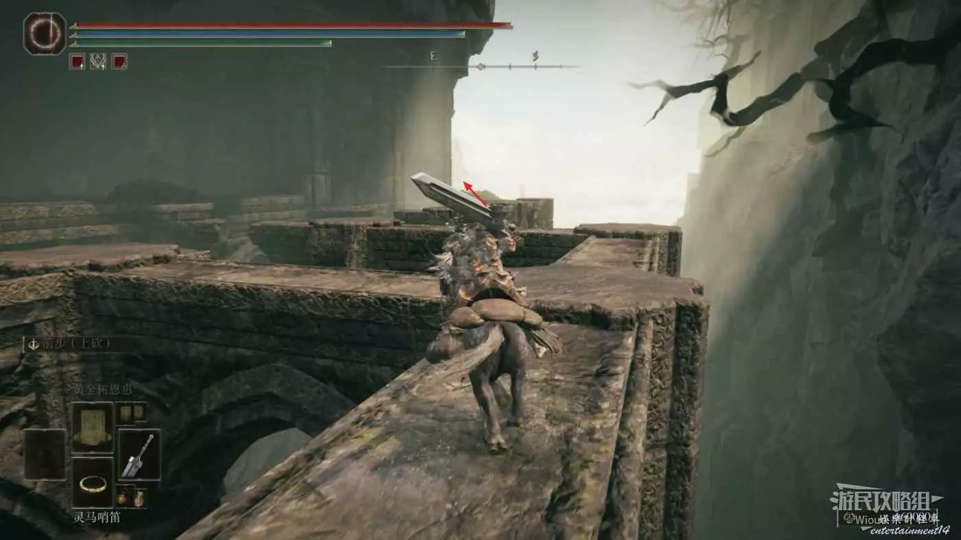 在第二層平臺往右看,有兩個士兵後面是巨大的黃金樹,從士兵的位置跳下去。