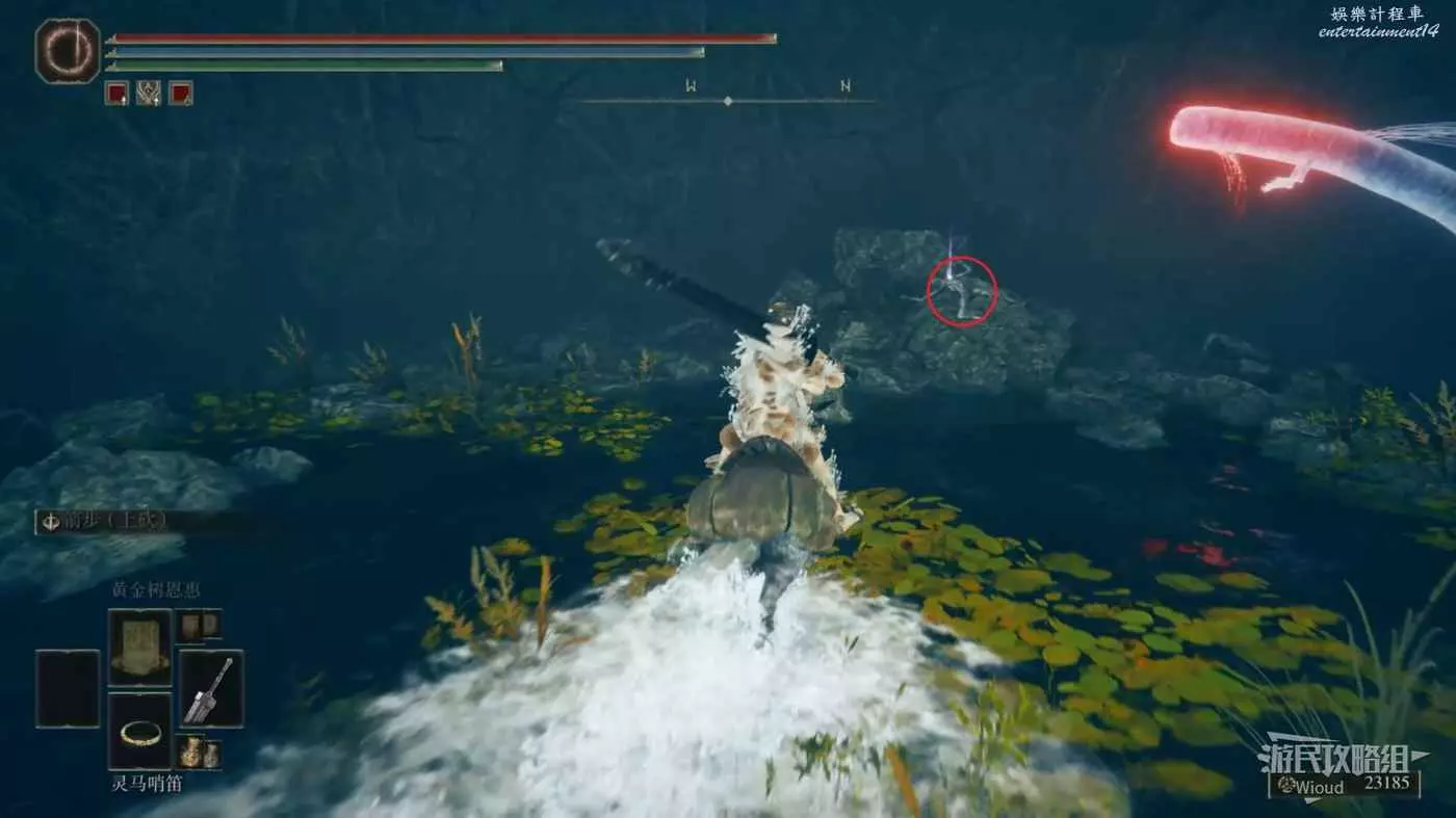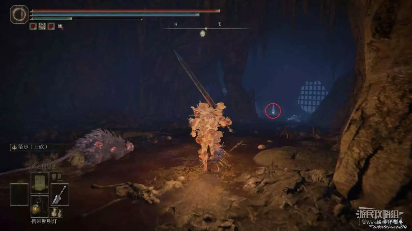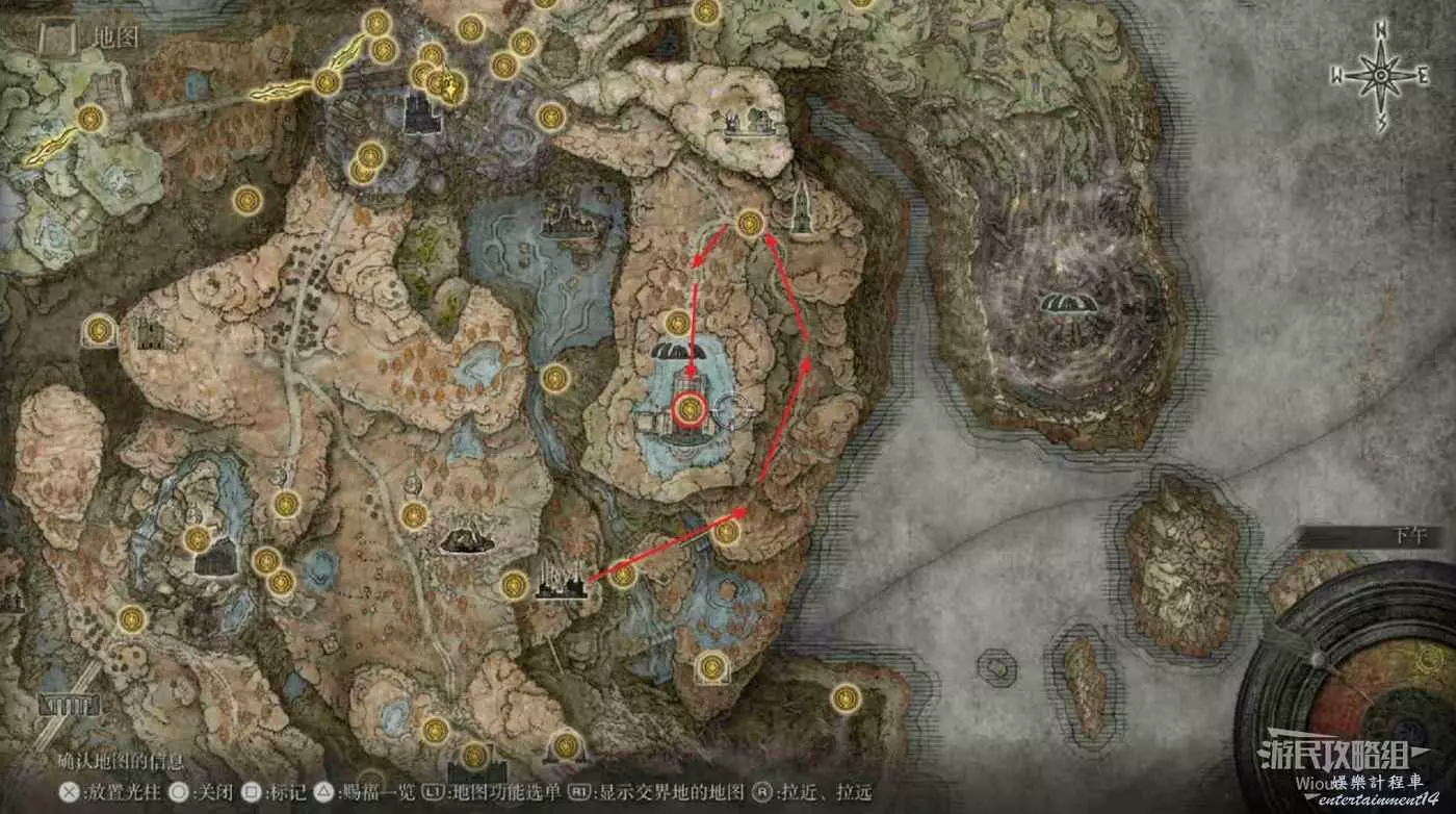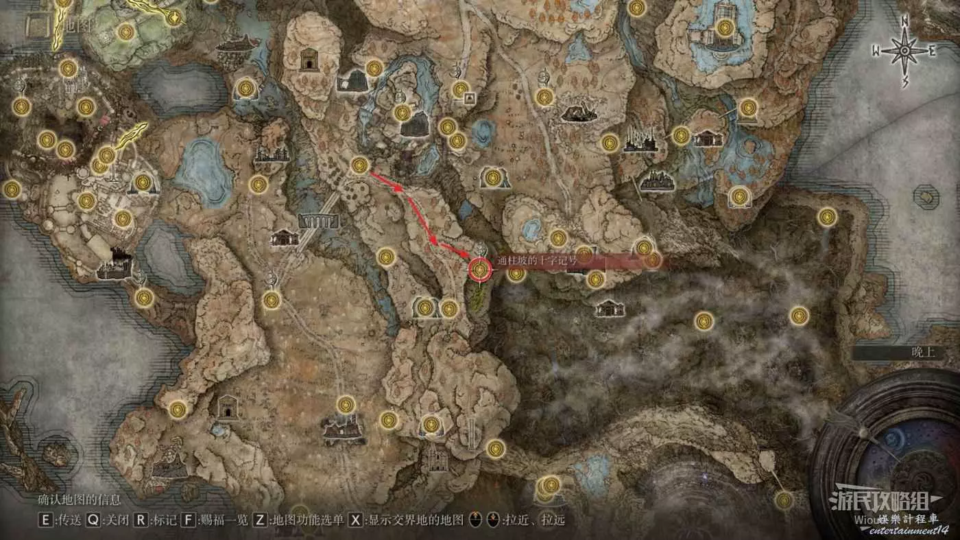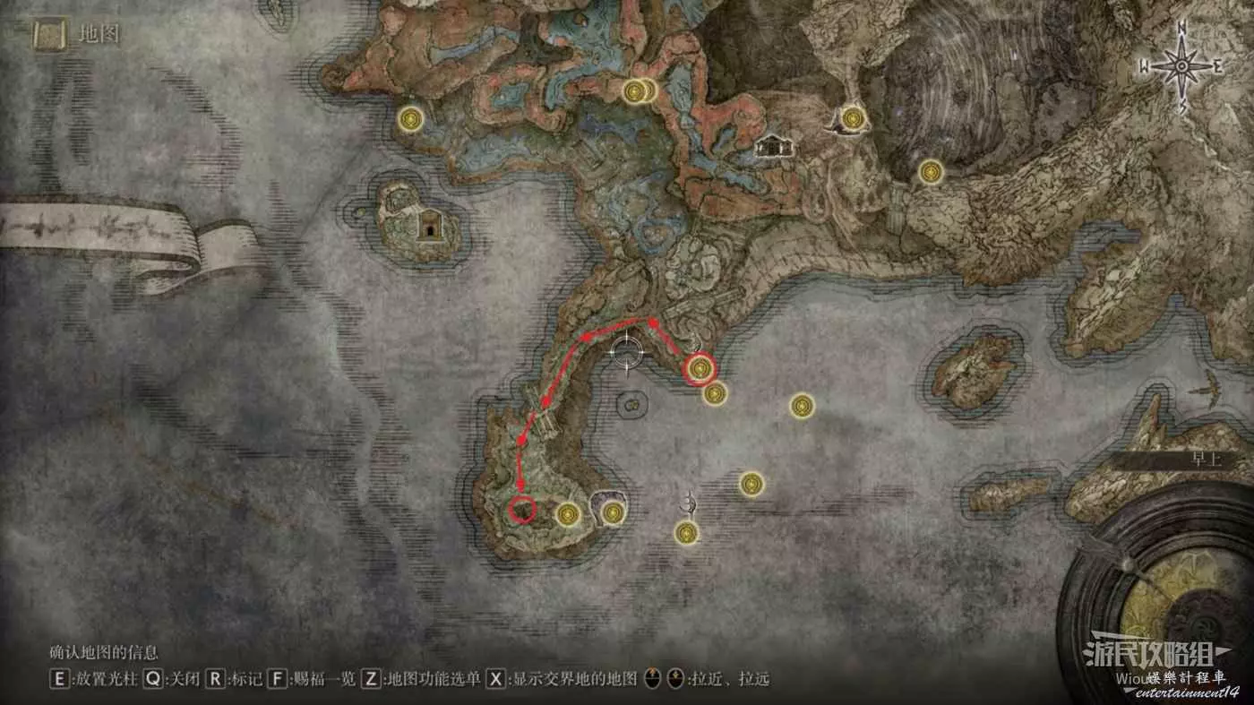不遠處可以點亮賜福【隱者河上游】,沿著下圖路線一直往下走到【驅暗地下墓地】的位置。
