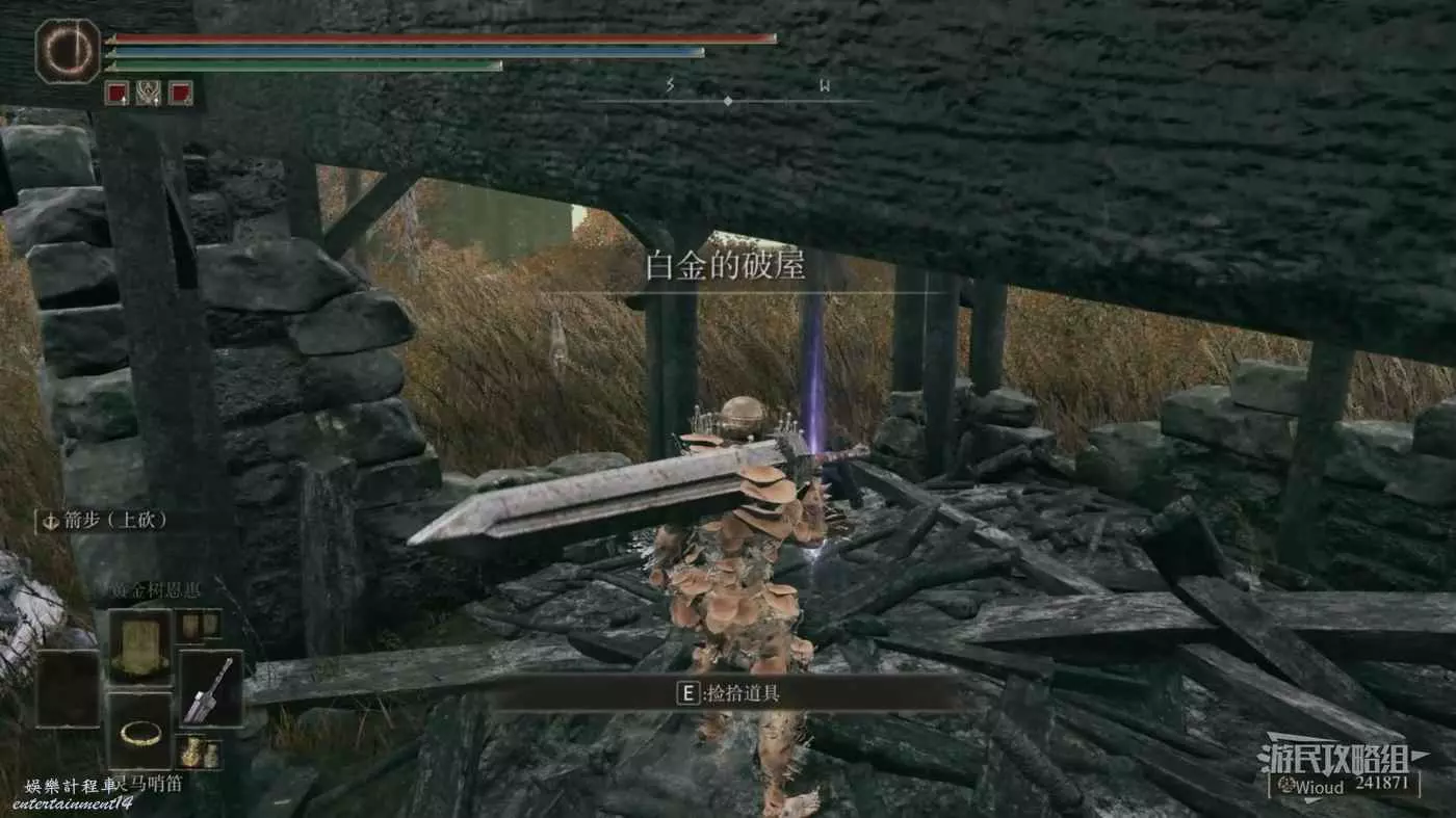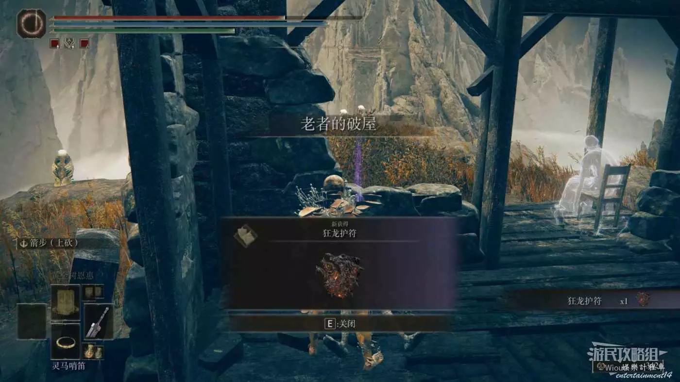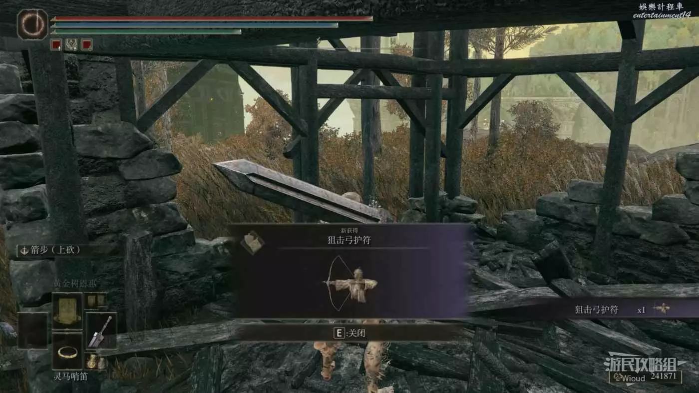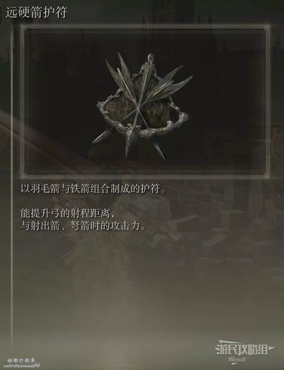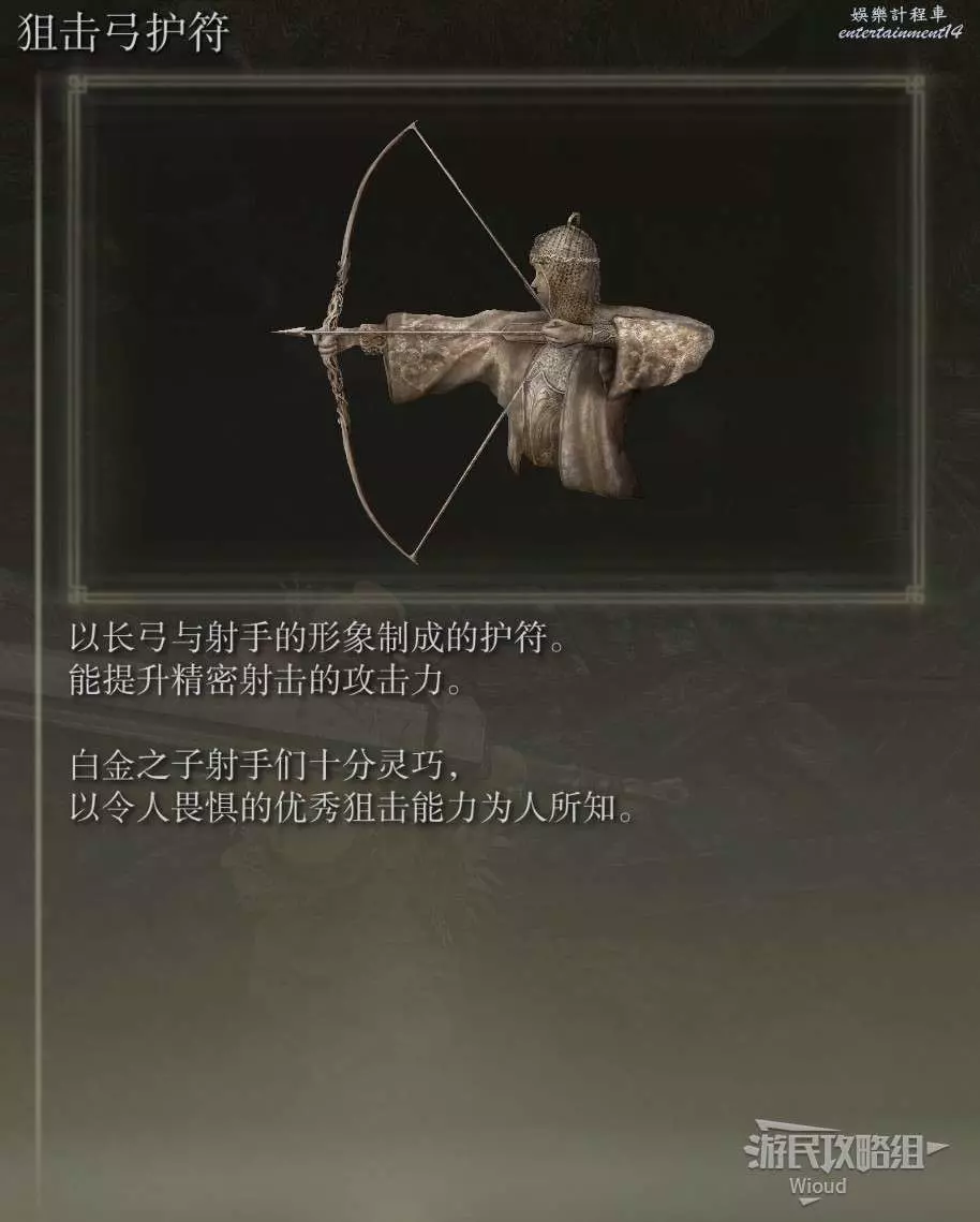 白金的破屋位置會遭遇一個射箭的白金之子攻擊,將其擊敗後拾取破屋裡面的光點即可獲得【弓箭手護符】。