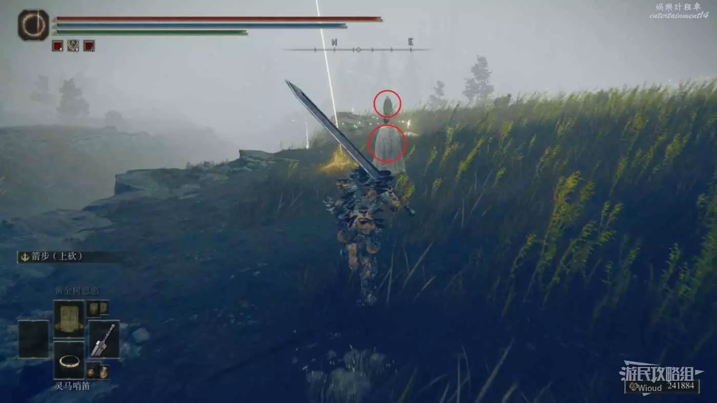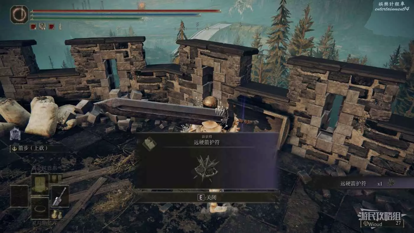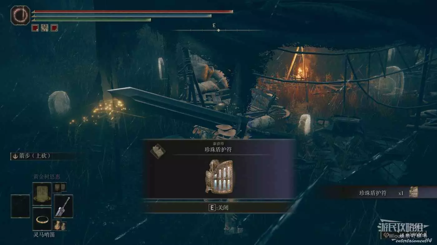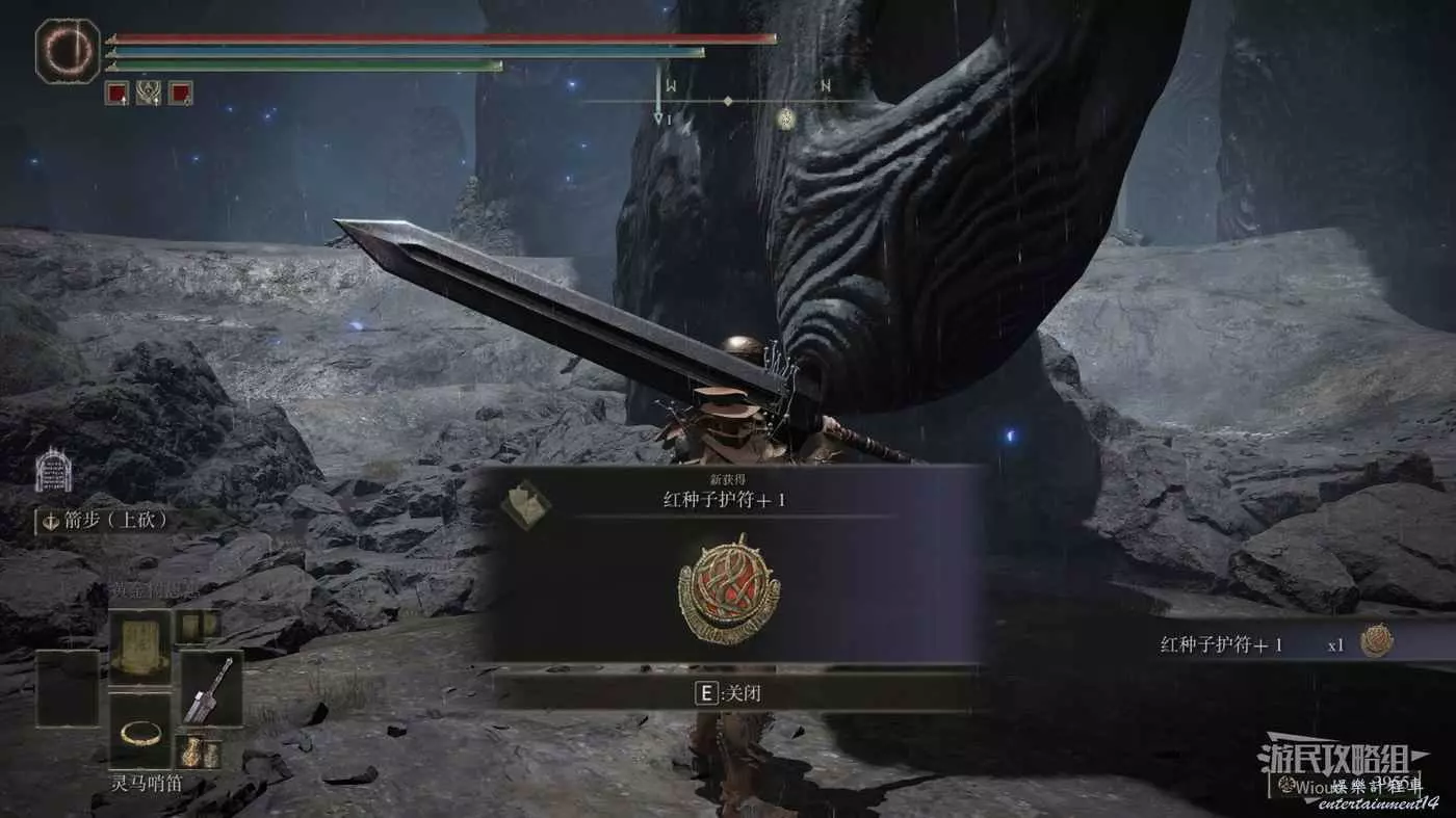 白金的破屋位置會遭遇一個射箭的白金之子攻擊,將其擊敗後拾取破屋裡面的光點即可獲得【弓箭手護符】。