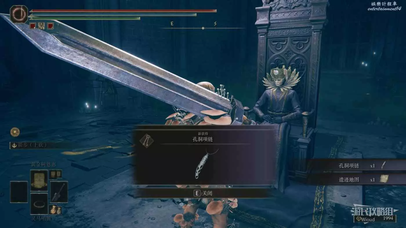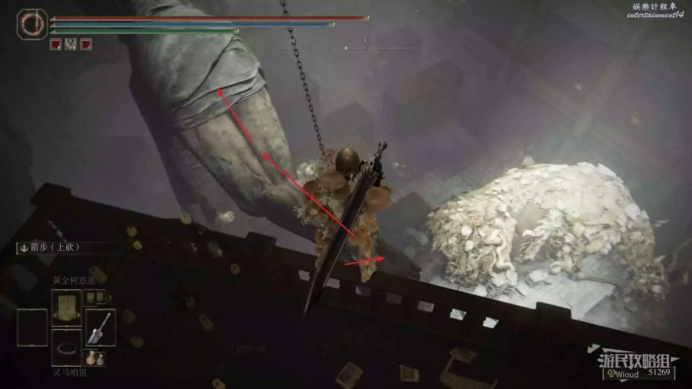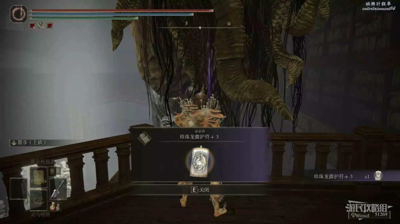 一直走到雕像頭的位置跳到前方的平臺,拾取頭部的光點獲得【珍珠龍徽護符+3】。