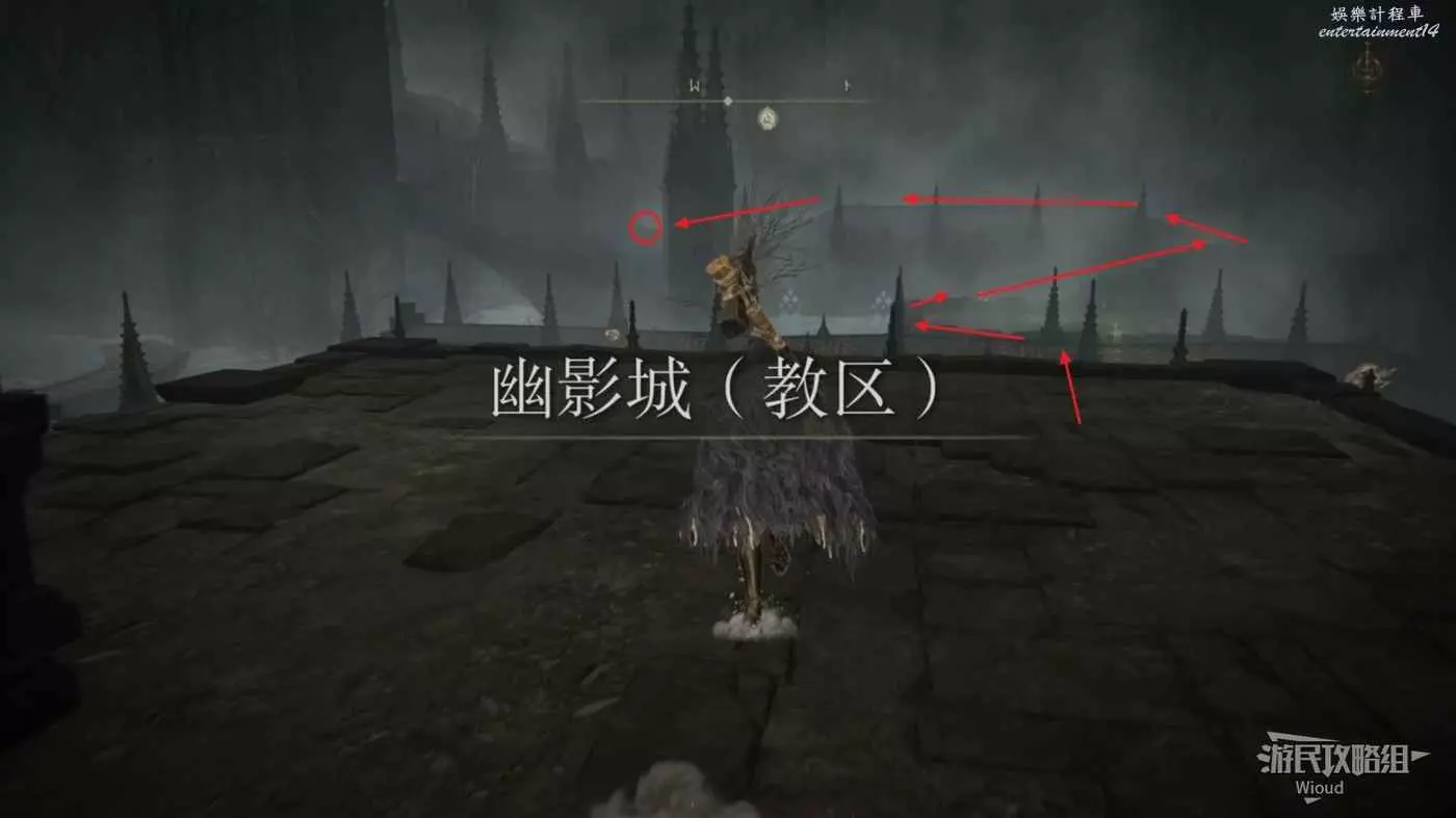 到達地面之後沿著下圖所示路線一直走到【幽影城教區】。