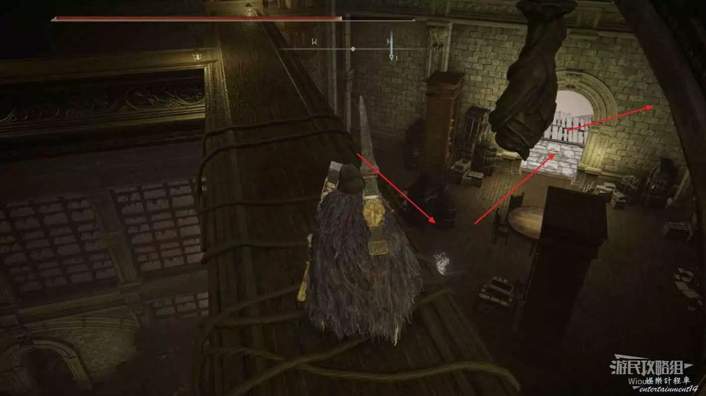 我們用走的原路返回【保藏庫四樓】賜福的位置,站到左前的柵欄位置,往下方雕像腳的位置跳。