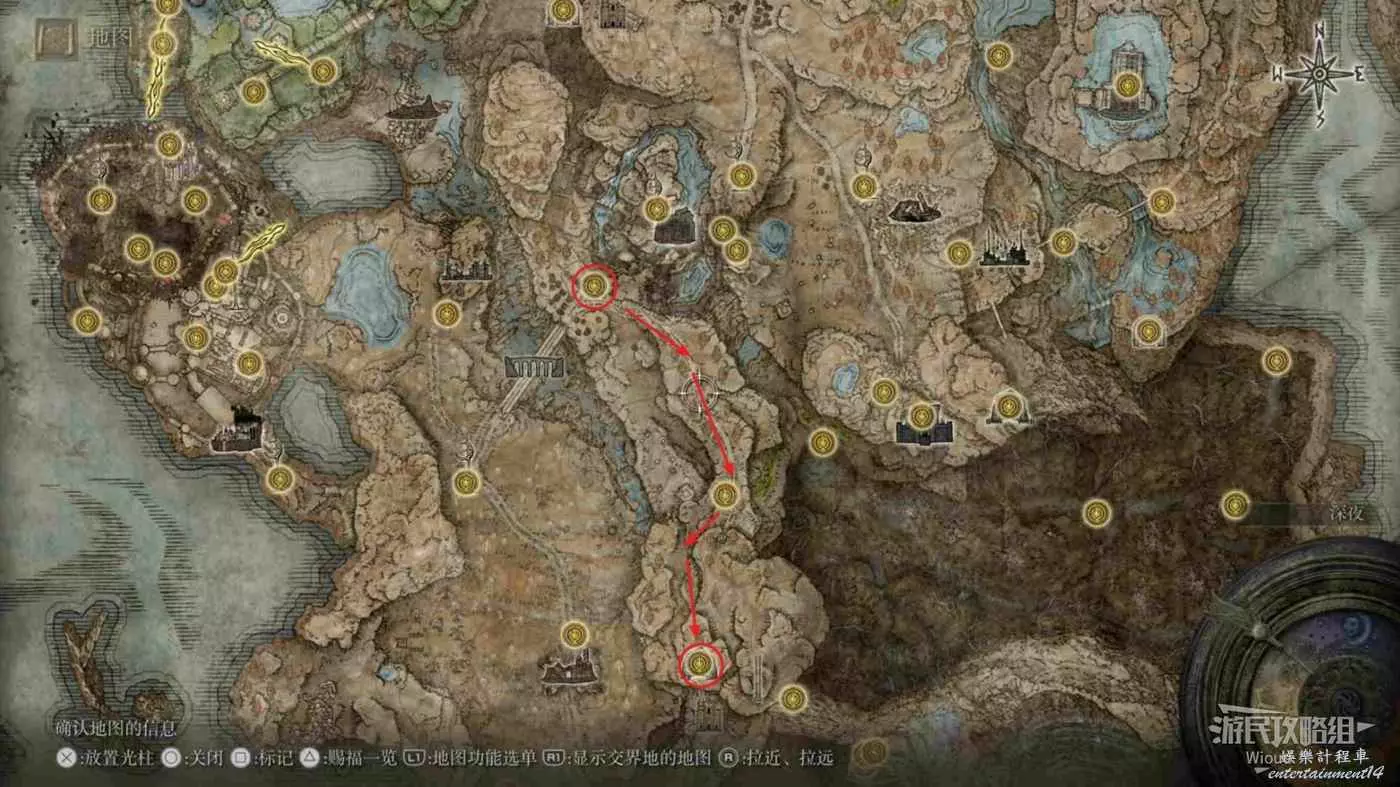 賜福【隱匿之地】出發按照下圖路線依次啟動【隱匿之地(橋邊)】與【指岩山丘】兩個賜福,繼續往右下的【狄歐指頭遺跡】走。