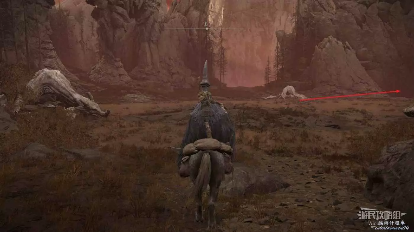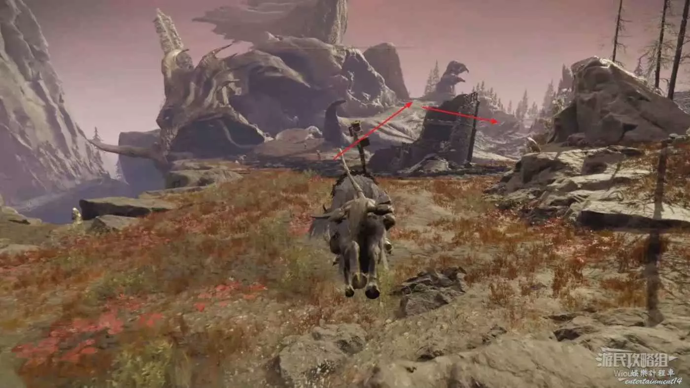 走到前方一段距離就能看到一個巨龍的屍體,然後我們沿著巨龍屍體右前方走,走一段距離就能看到紅色的花海地區。