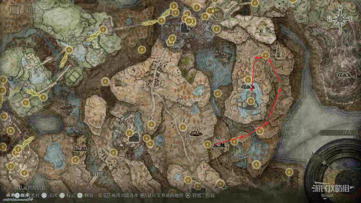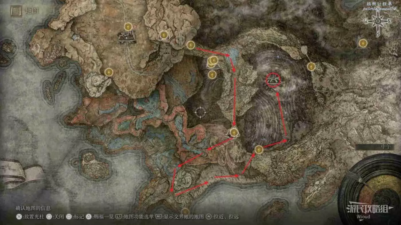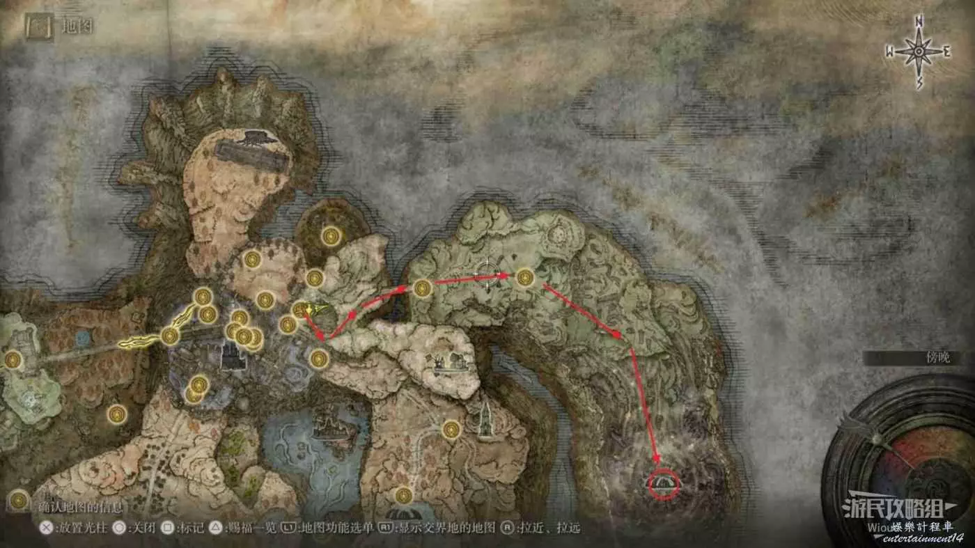 我們首先啟動遺跡1,從恩希斯城前的賜福【城的前方】出發按照下圖路線進入洞穴【龍洞】。