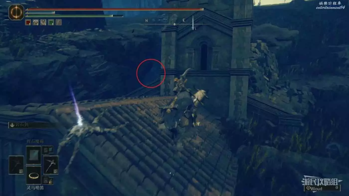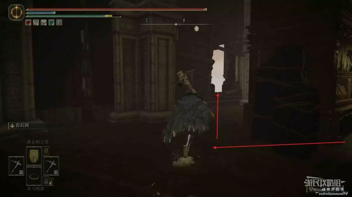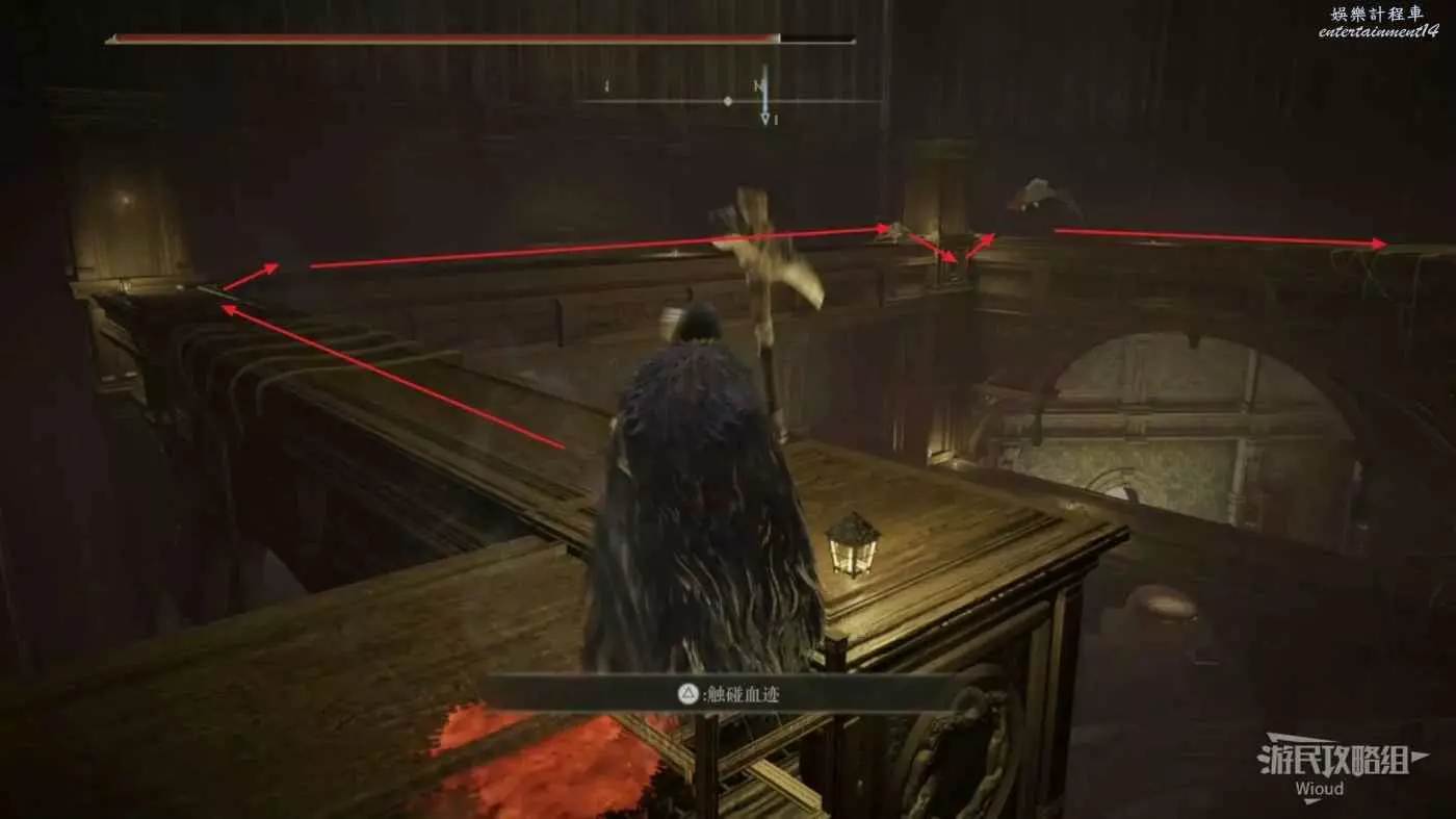 來到橫樑上層沿著下圖路線繼續在橫樑上走,注意右側第二個拐角位置需要跳一下,如果掉下去還得重新按照剛才的路線跑一遍。