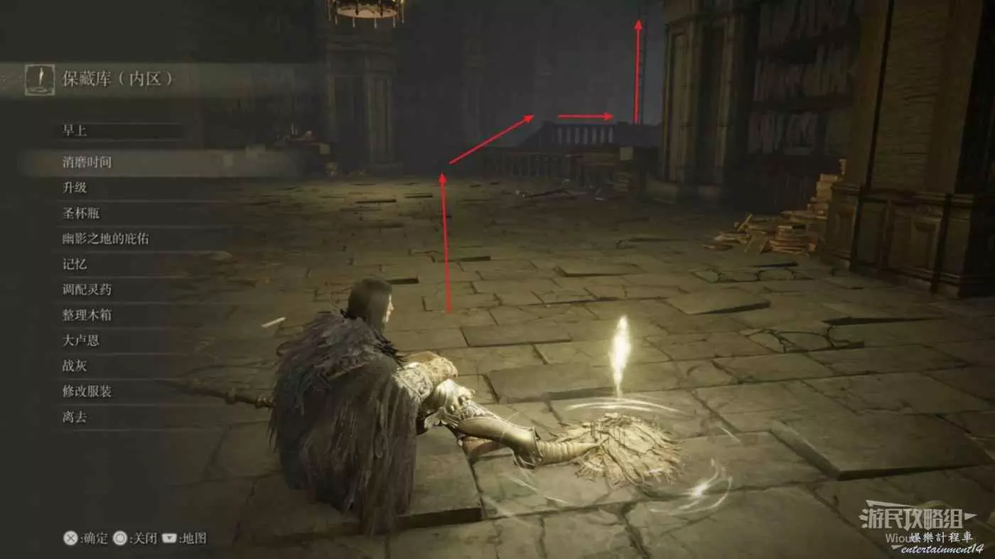 爬到第三層的位置,先走到前方小門的位置,此時往右後方看,通過此處的出口走到外側樓梯,沿著樓梯爬到上層啟動賜福【保藏庫(閣樓)】。