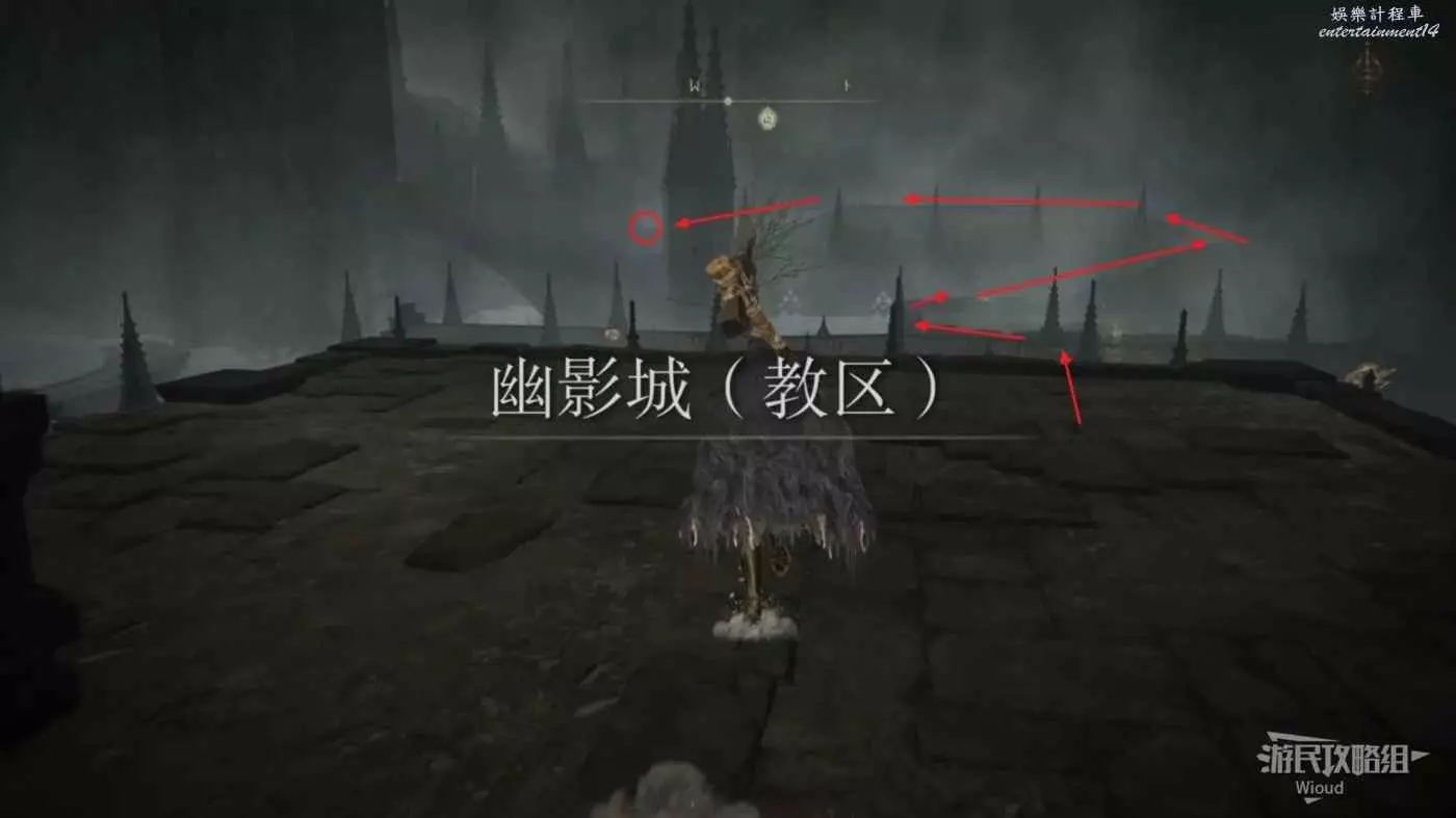 接著從教堂出發沿著下圖所示路線一直走到【幽影城教區】。