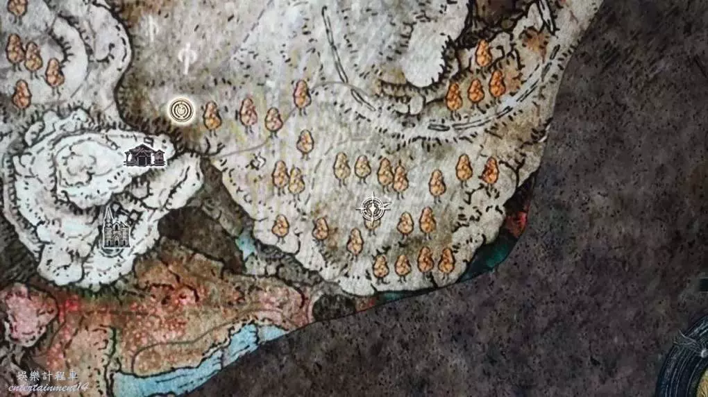 以火吻廢墟為方向,圖上右中建築內是逆手刀獲取點