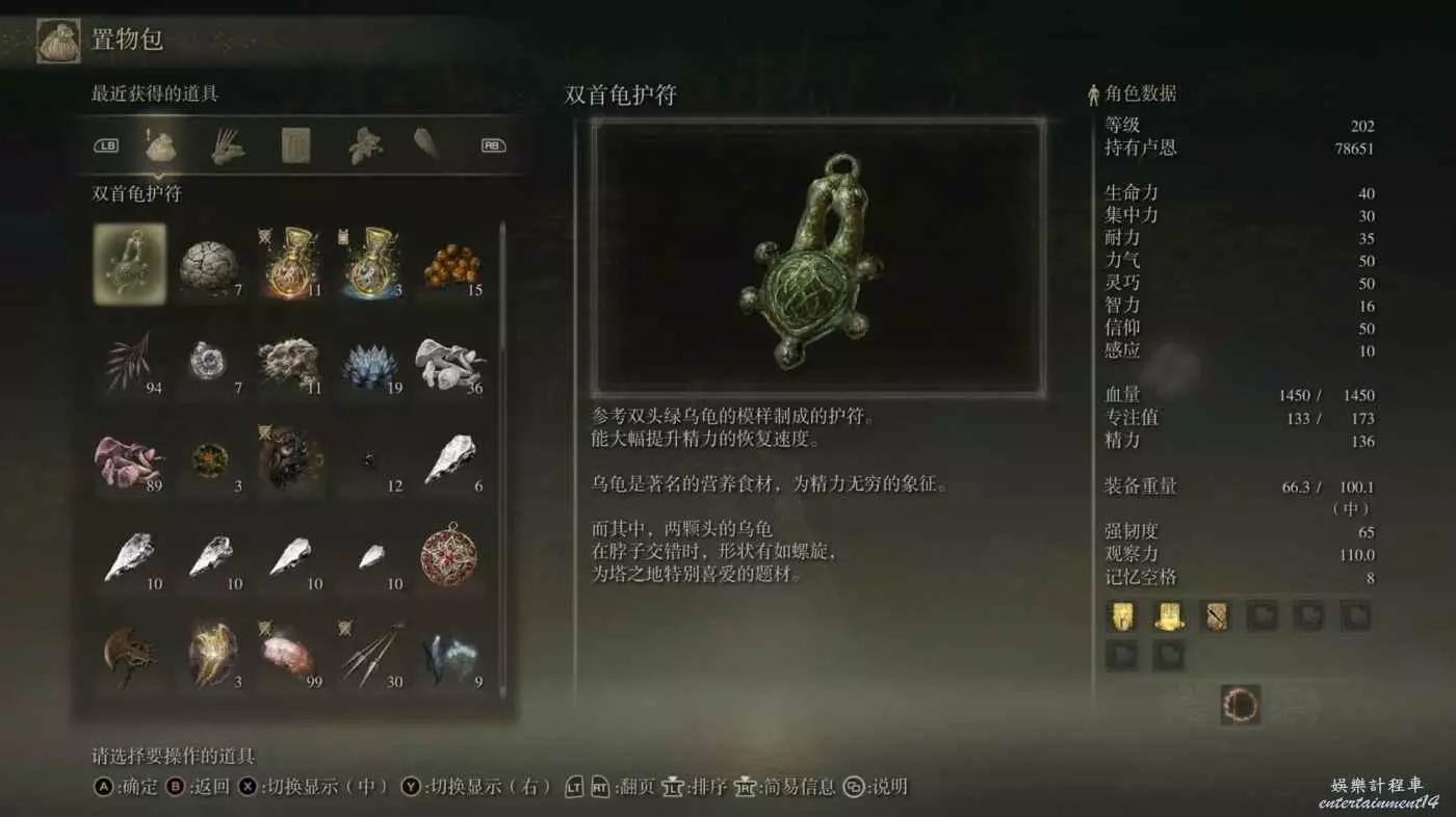 艾爾登法環 (Elden Ring) 黃金樹幽影DLC 雙首龜護符獲取方法 22 6 月 2024-06-22 廣告 作者:酒窩仙人 來源:艾爾登法環吧 DLC中BOSS人均瘋狗,小兵人均劍聖,本體中不甚缺乏的綠條在DLC中還是比較有存在感的,所以DLC也新增了綠龜護符+2,也就是雙首龜護符,大幅提高精力恢復速度。 獲取路線如下: 遊戲人物基礎精力恢復是45點每秒,本體綠龜護符是增加8點/s的精力恢復速度,相當於提升了17%左右,雙首龜護符等待測試,但是體感速度提高了不少 在河流盡頭的屍體上拾取,另外,在河流途中會有一隻樹靈,傷害和血量較高,注意提前準備好