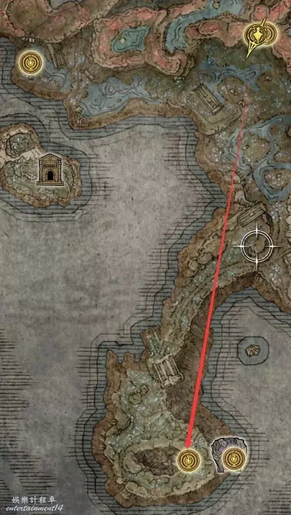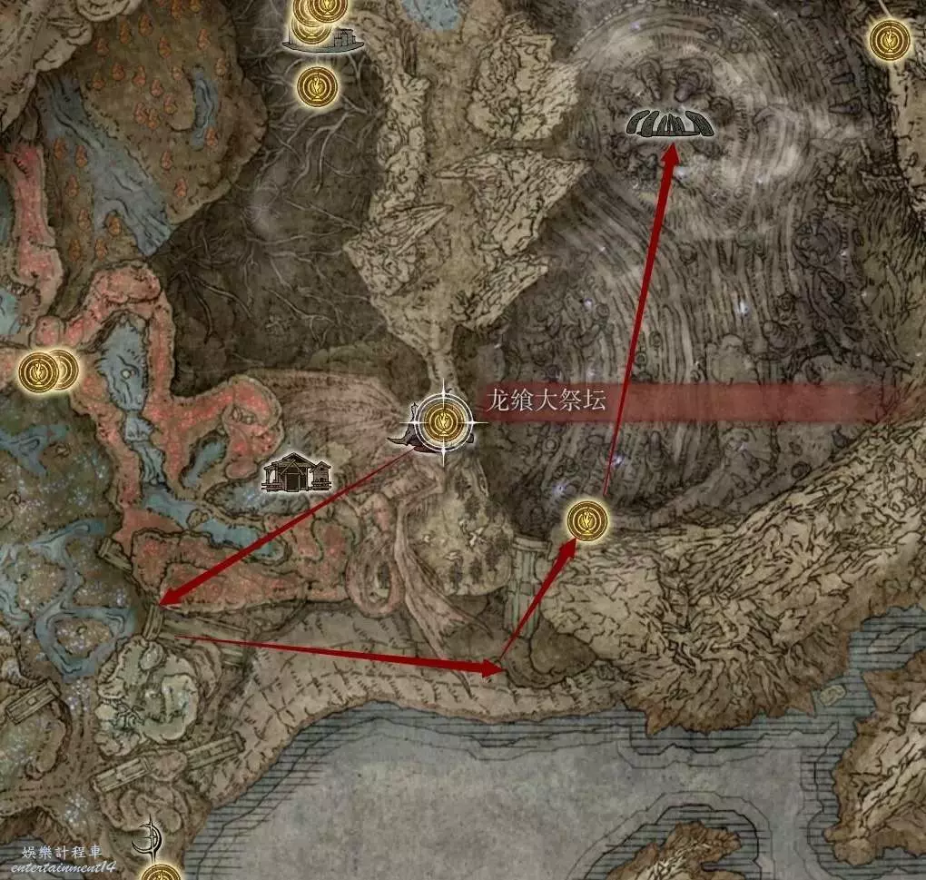 隨後來到之前到過的龍饗大祭壇。這次我們向巨型石像龍的後方走,會走進一片紅色花海(卡羅隱藏墓地)在箭頭所指的懸崖附近可以下到最南部的海岸邊,隨後沿著海岸向東走一個來到利亞指頭遺跡