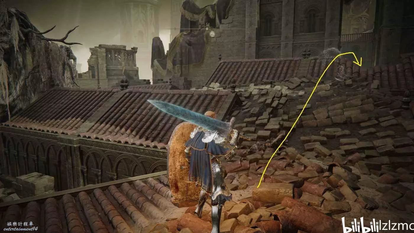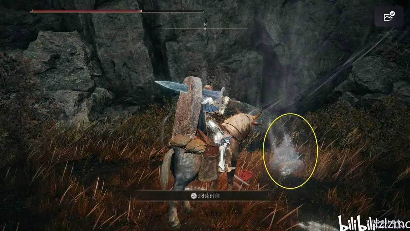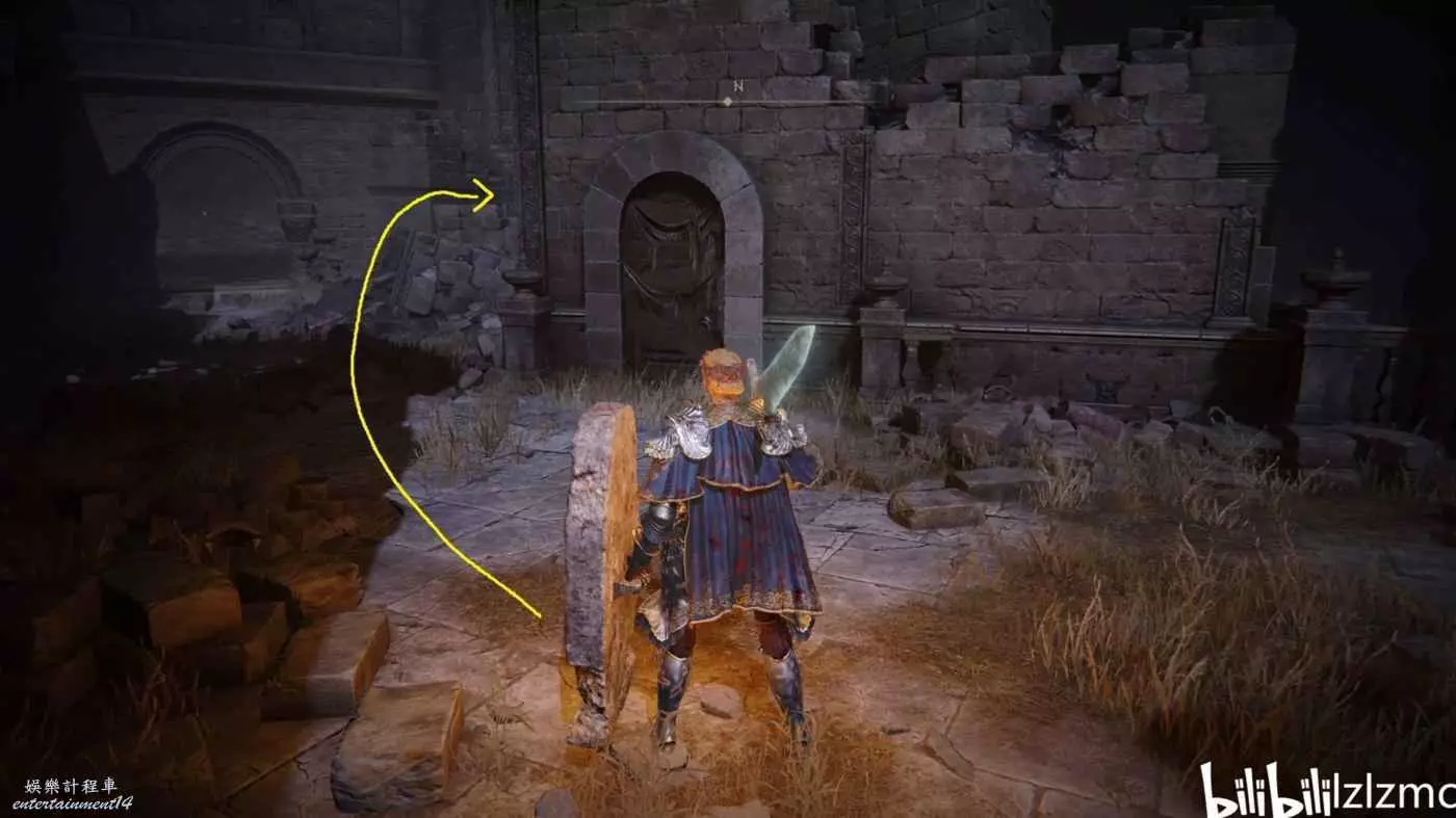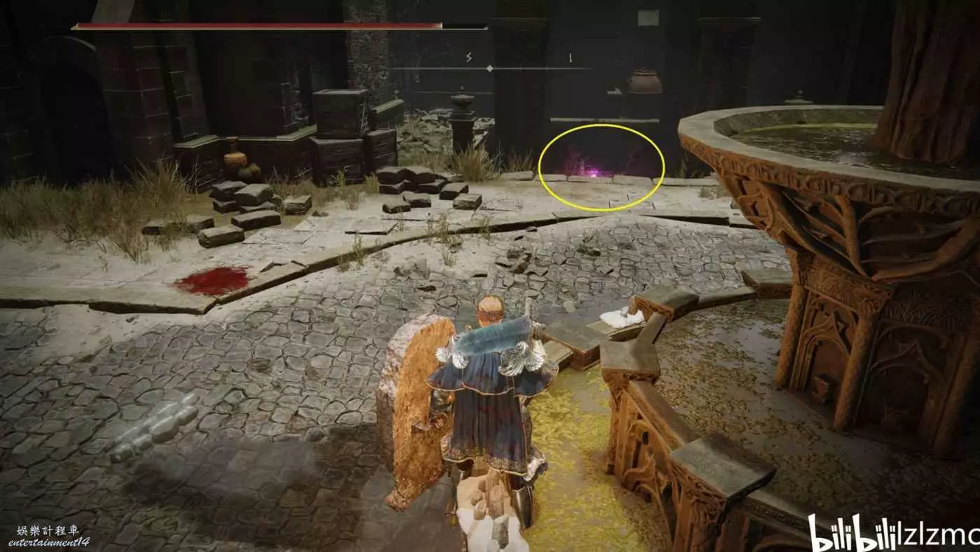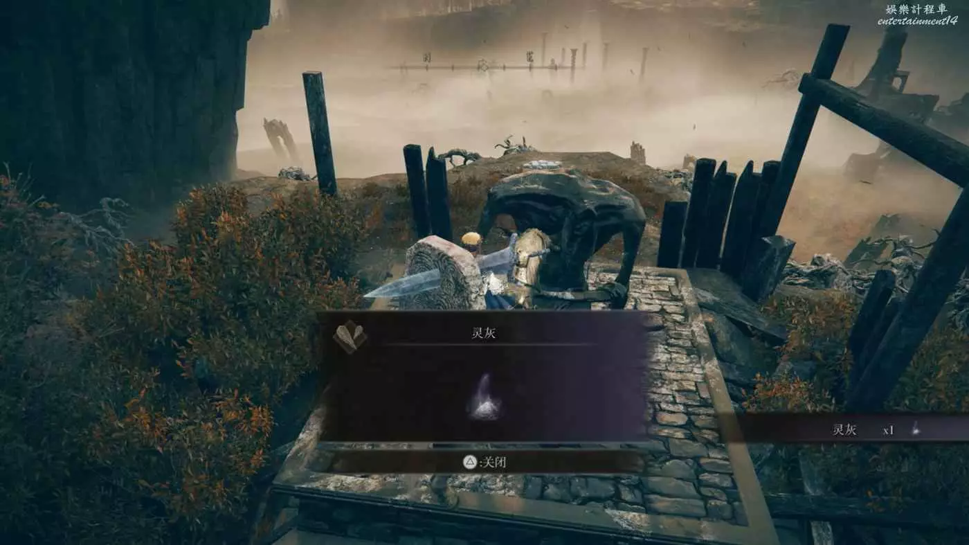 戰灰【勇猛獅子斬】:賜福三叉口的十字記號,主幹道逆時針貼著城堡右側牆壁跑到如圖位置拿到戰灰。