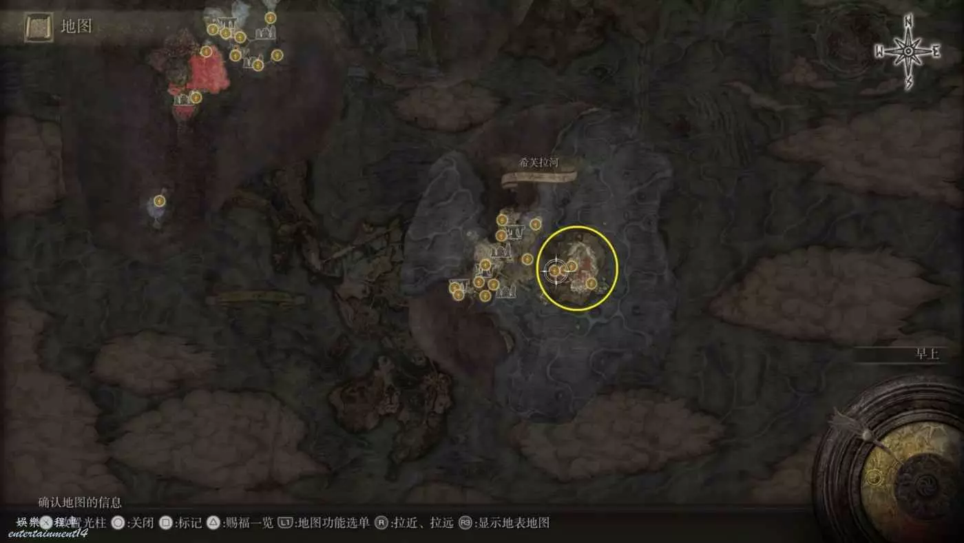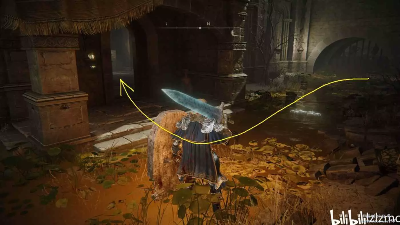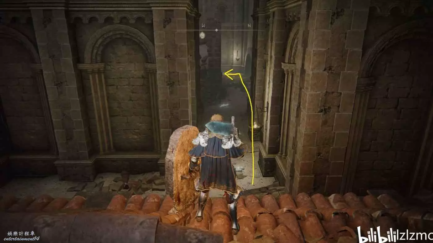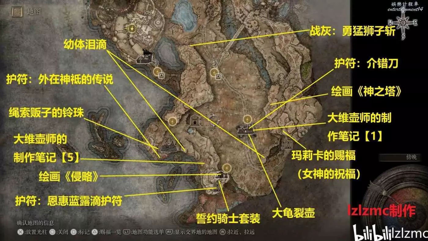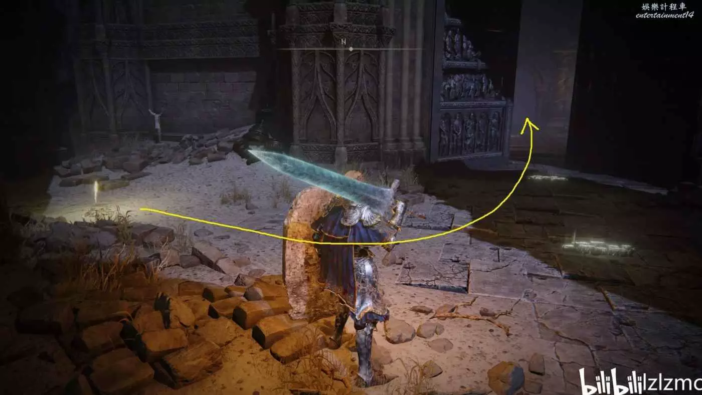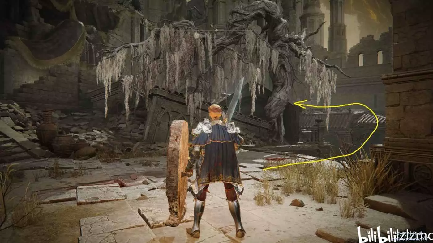 戰灰【勇猛獅子斬】:賜福三叉口的十字記號,主幹道逆時針貼著城堡右側牆壁跑到如圖位置拿到戰灰。