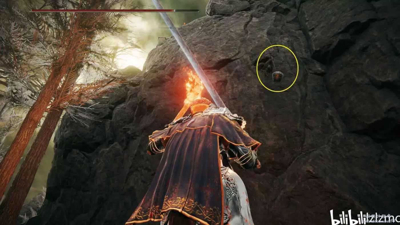 藥草販子的鈴珠:賜福通柱坡中段,一直向南走,就在打敗古龍人後,如圖黃圈位置,把懸崖上的罐子用弓箭打破獲得鈴珠。