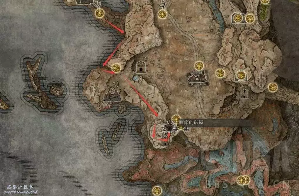 第一幅如圖,畫家的破屋,這裡是第一幅侵略,這個還是比較好找的,大概開圖路徑我也標註了。