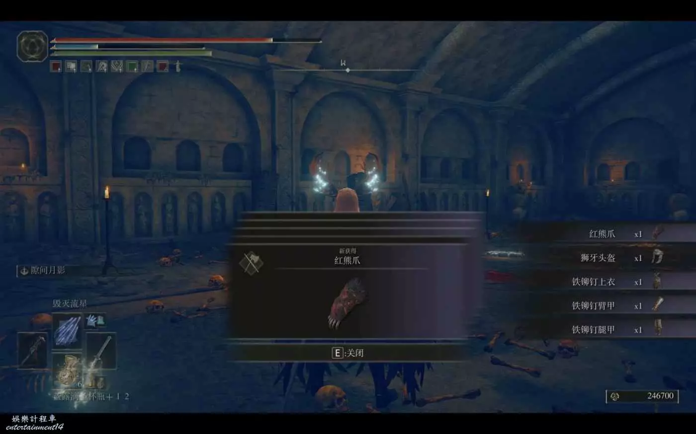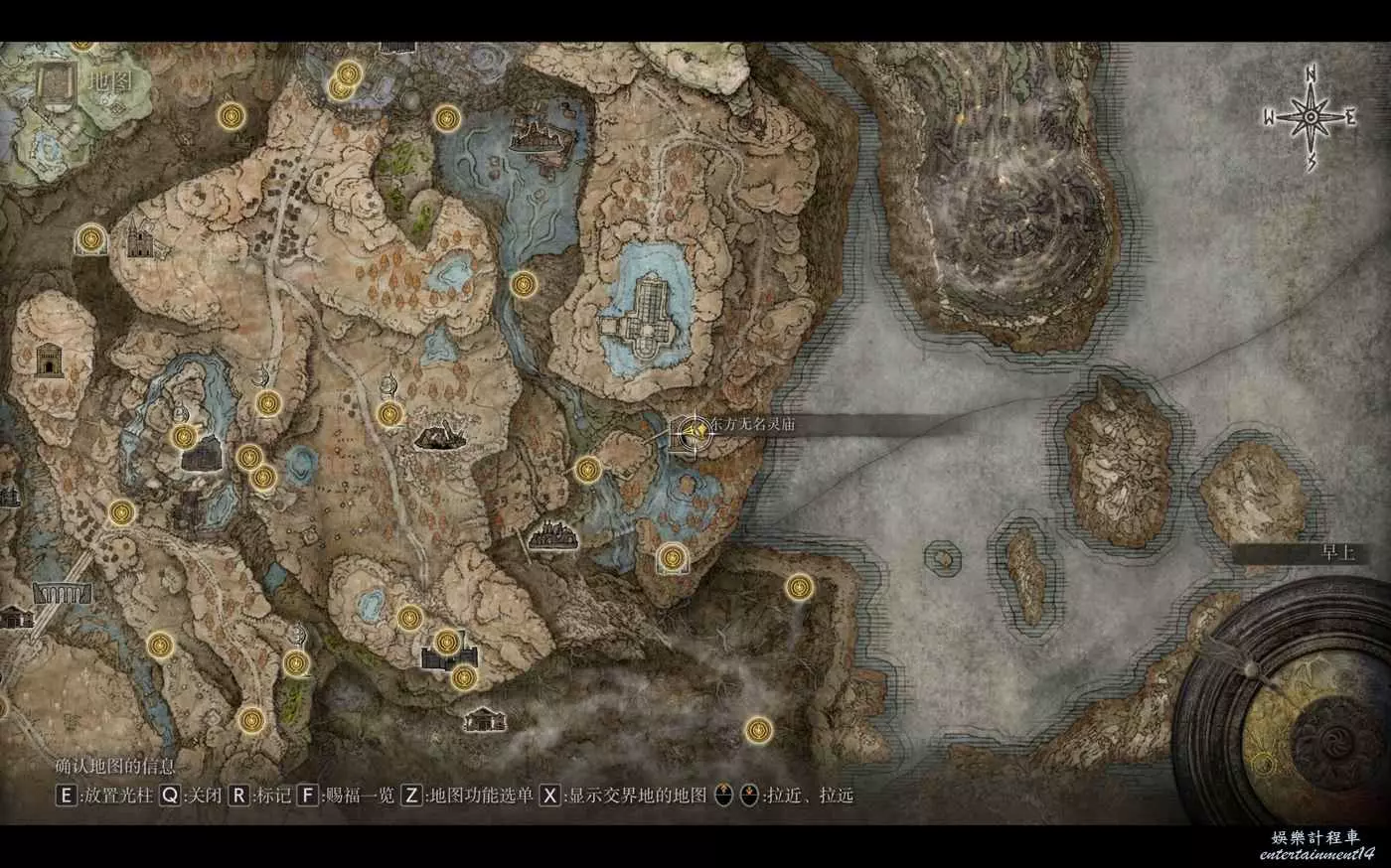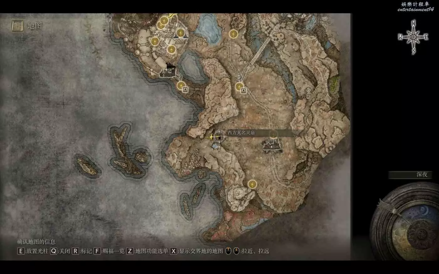 位置如圖所示,傳送到該地左側賜福沿著岸邊的台階往下跳,落地順著小螃蟹往裡繞就能找到。BOSS是羅刹,跟上面三個不是一個等級,韌性高,傷害猛,一身都是數值美,我+12幽影庇護,中甲兩刀做掉