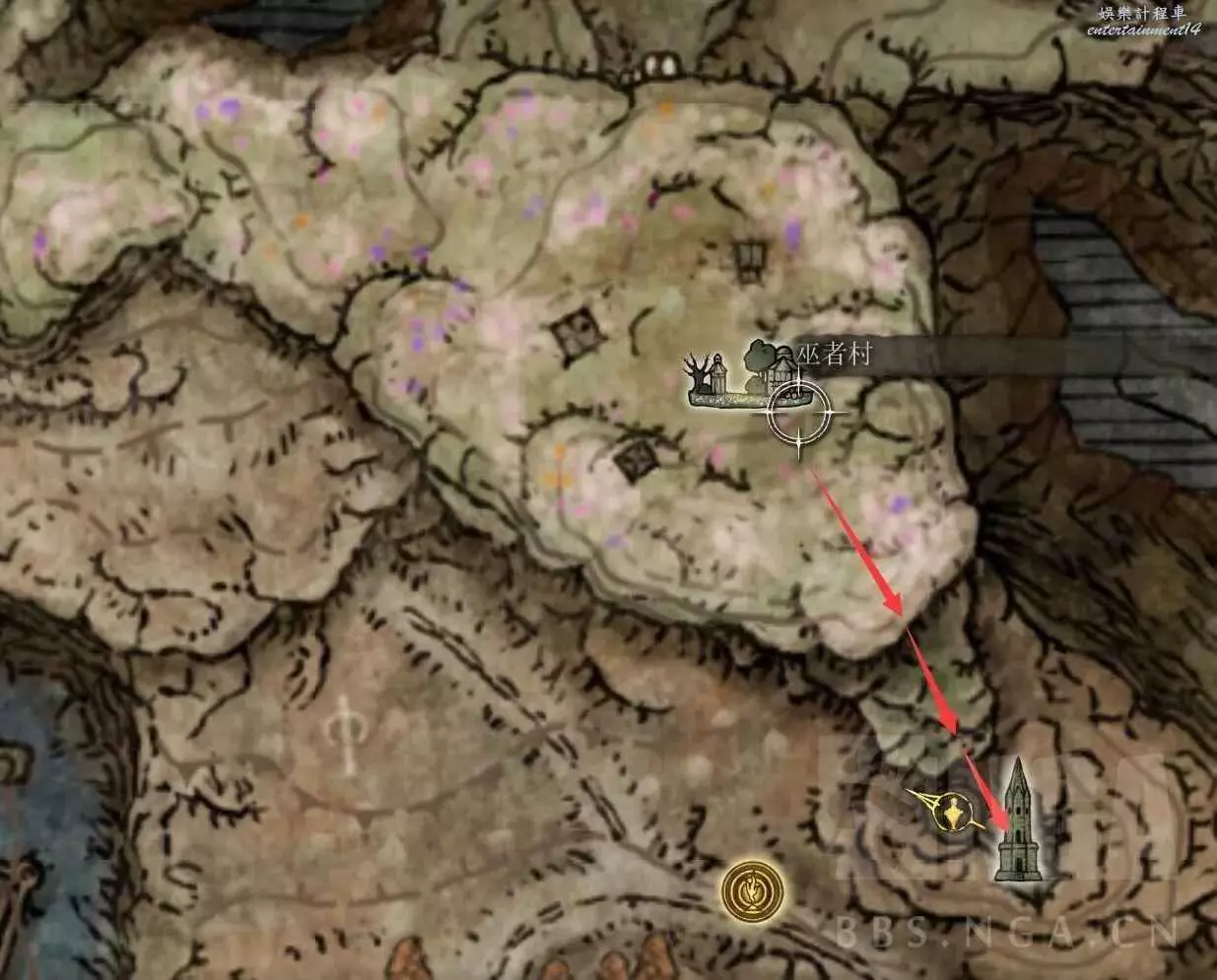 然後從巫者村我標記的位置往下跳 可以直接通往魔法師塔的高層