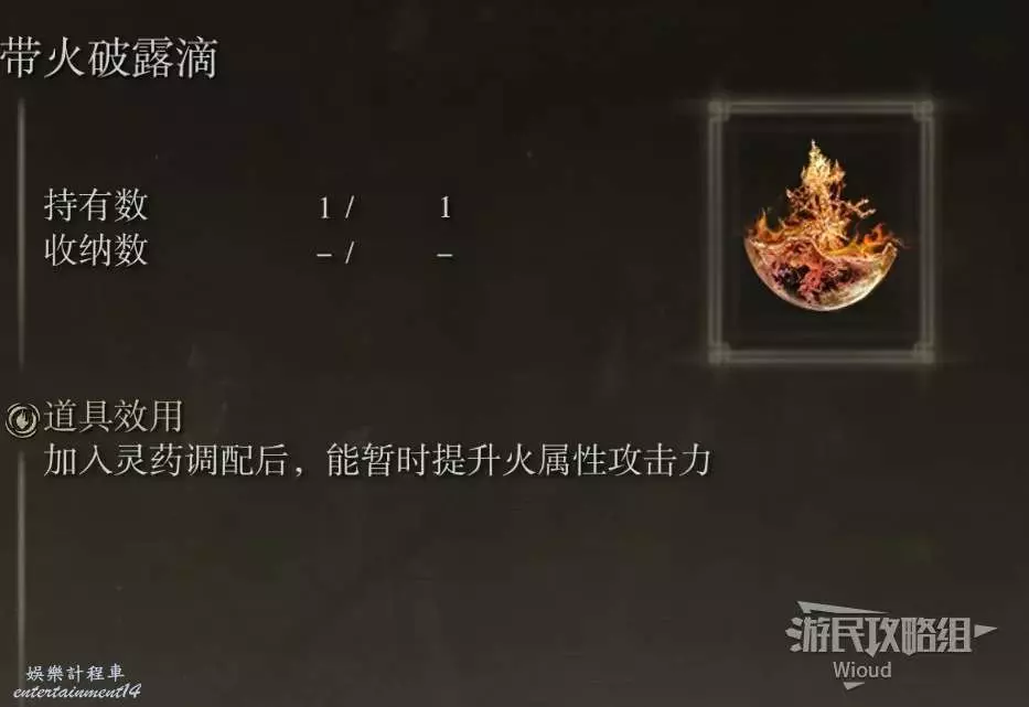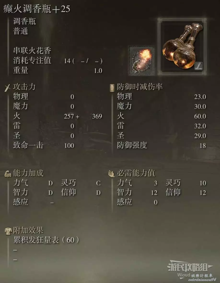 與黃金數立誓相比,火焰啊賜予我力量的用途更加狹窄,通常只有使用火焰屬性傷害的流派才會使用,而癲火調香瓶正好就是火焰傷害。