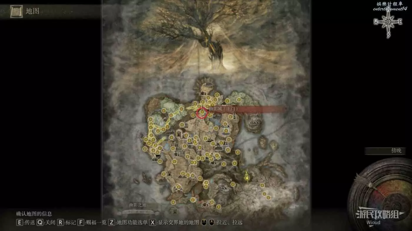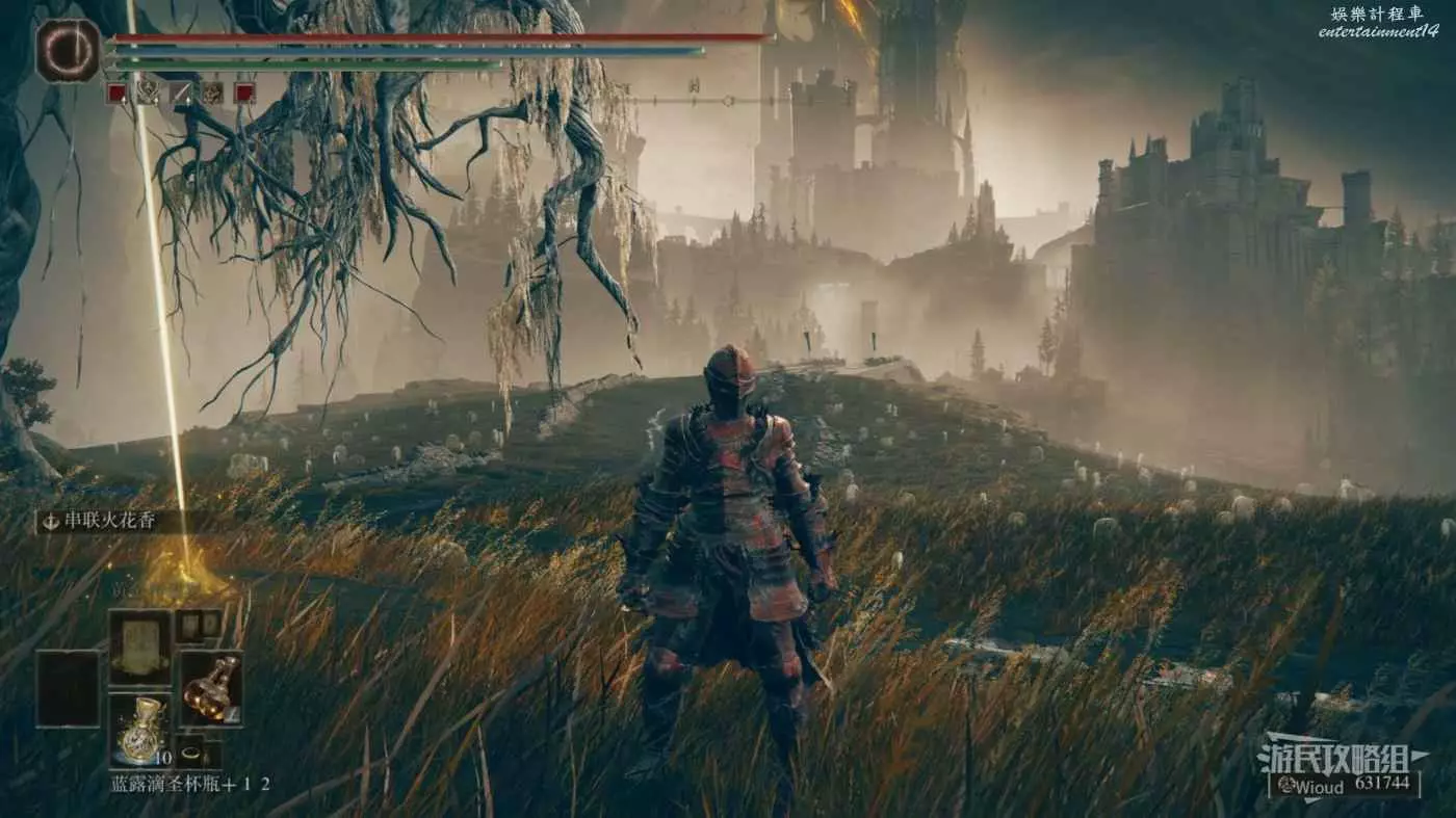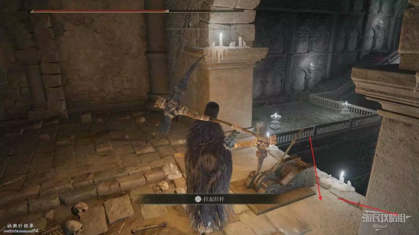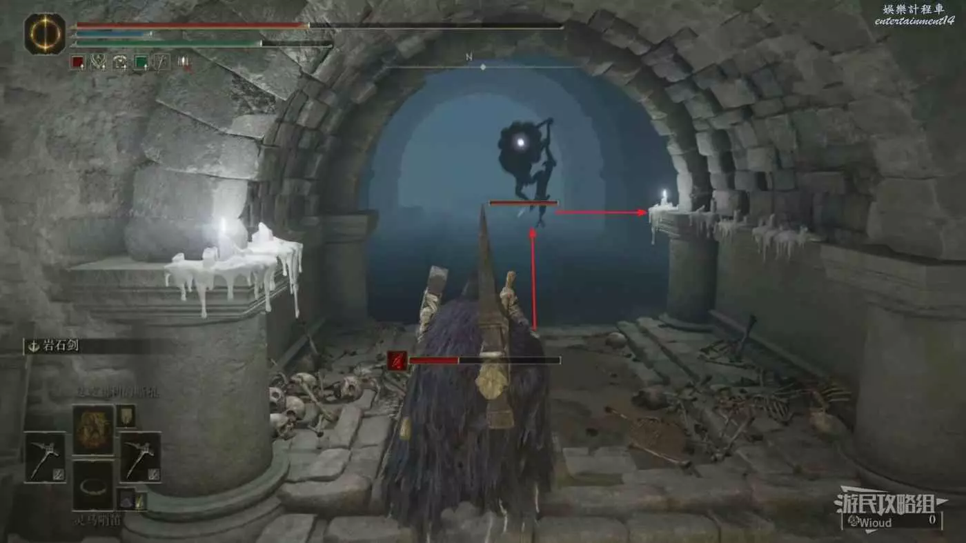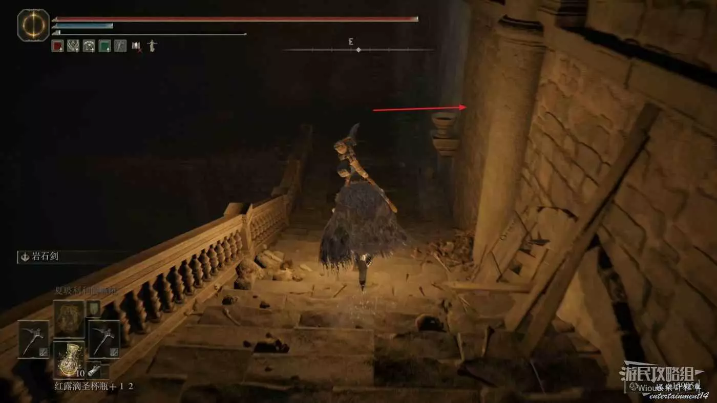 提前裝備遠端禱告或弓箭等遠端武器,從賜福【幽影城(正門)】出發,乘坐升降梯到達幽影城下方門口。