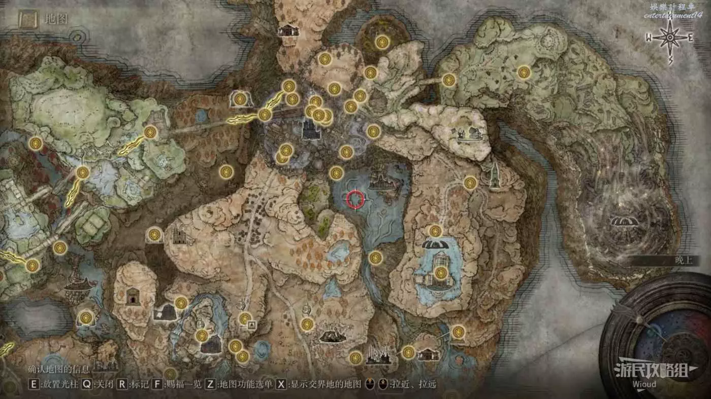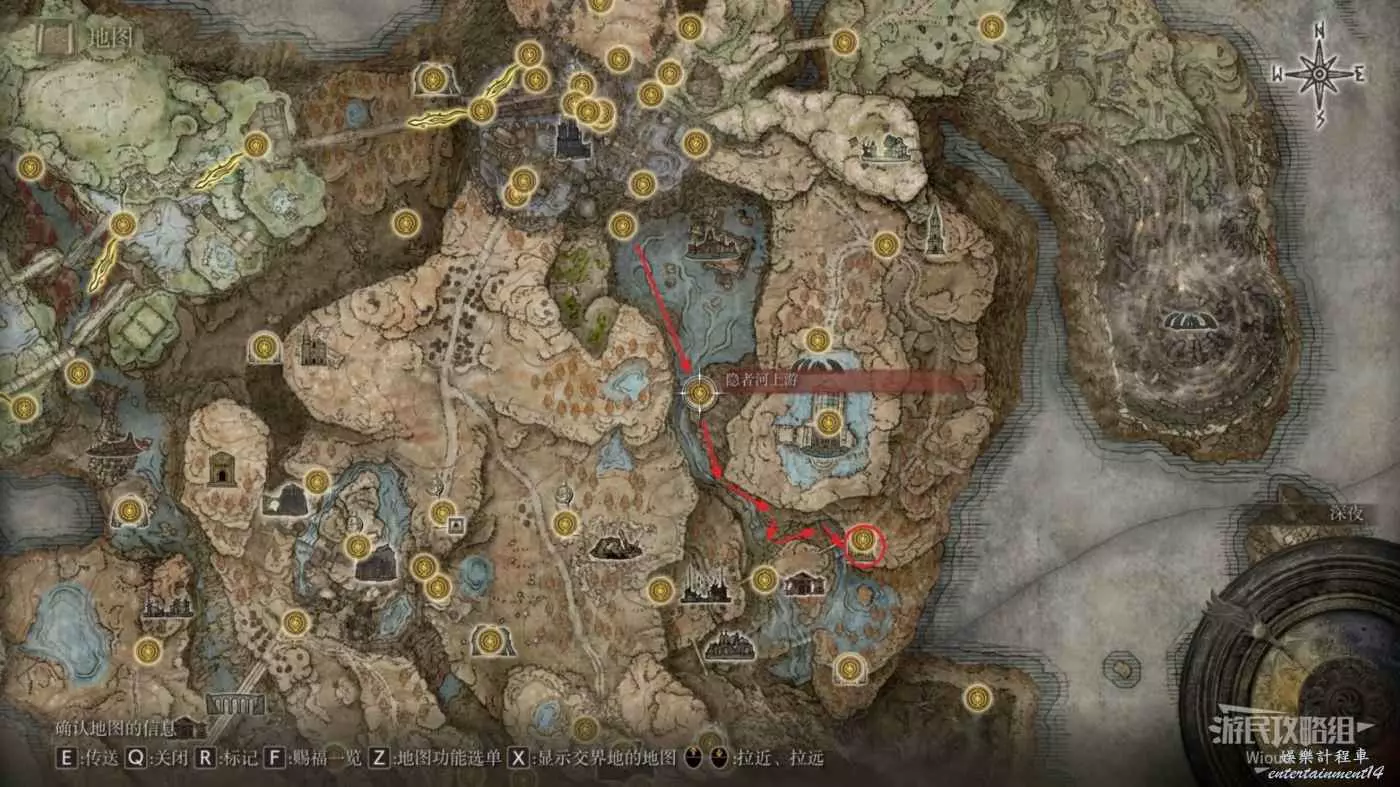 不遠處可以點亮賜福【隱者河上游】,沿著下圖路線往地圖右下走即可到達東方無名靈廟的位置。
