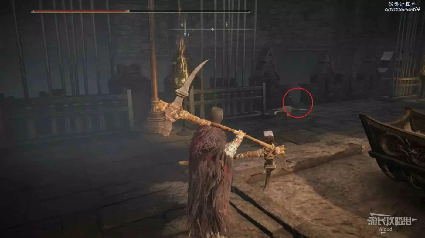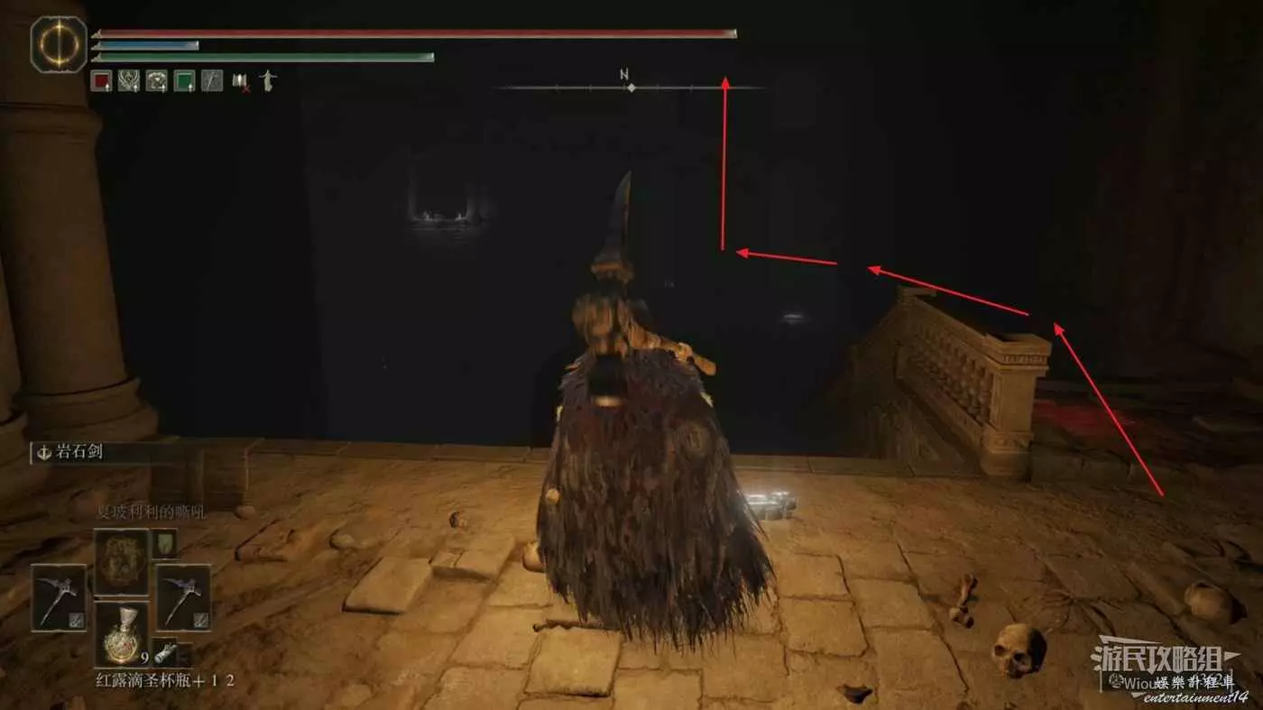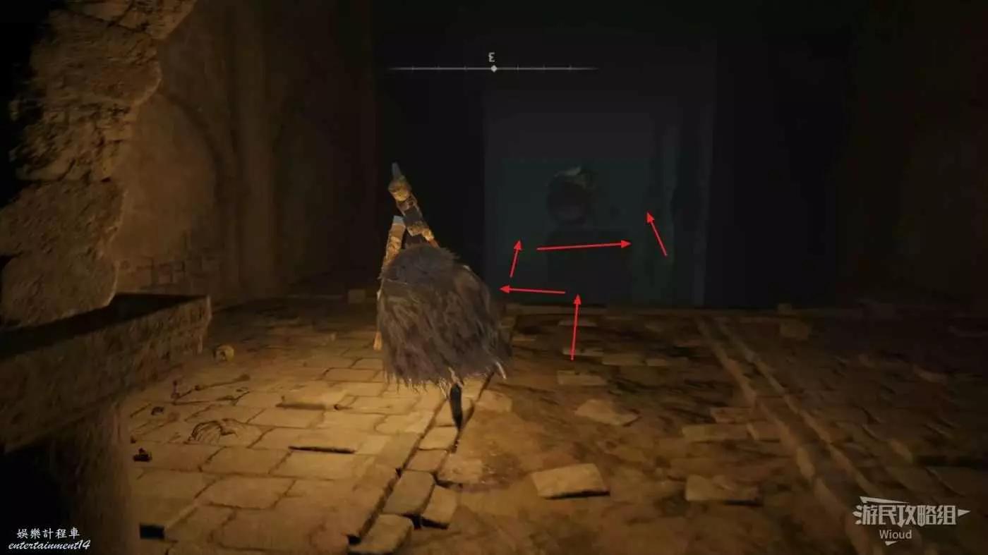 從剛才的柵欄位置進入左側的房間,從前方往下跳,接著往後方走就能到剛才機關的位置。