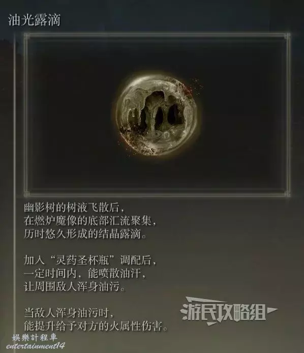從幽影城下方賜福【城底積水處】出發,前方安堤廢墟右側的燃爐魔像殘骸附近有一個活的燃爐魔像,擊敗獲得油光露滴。