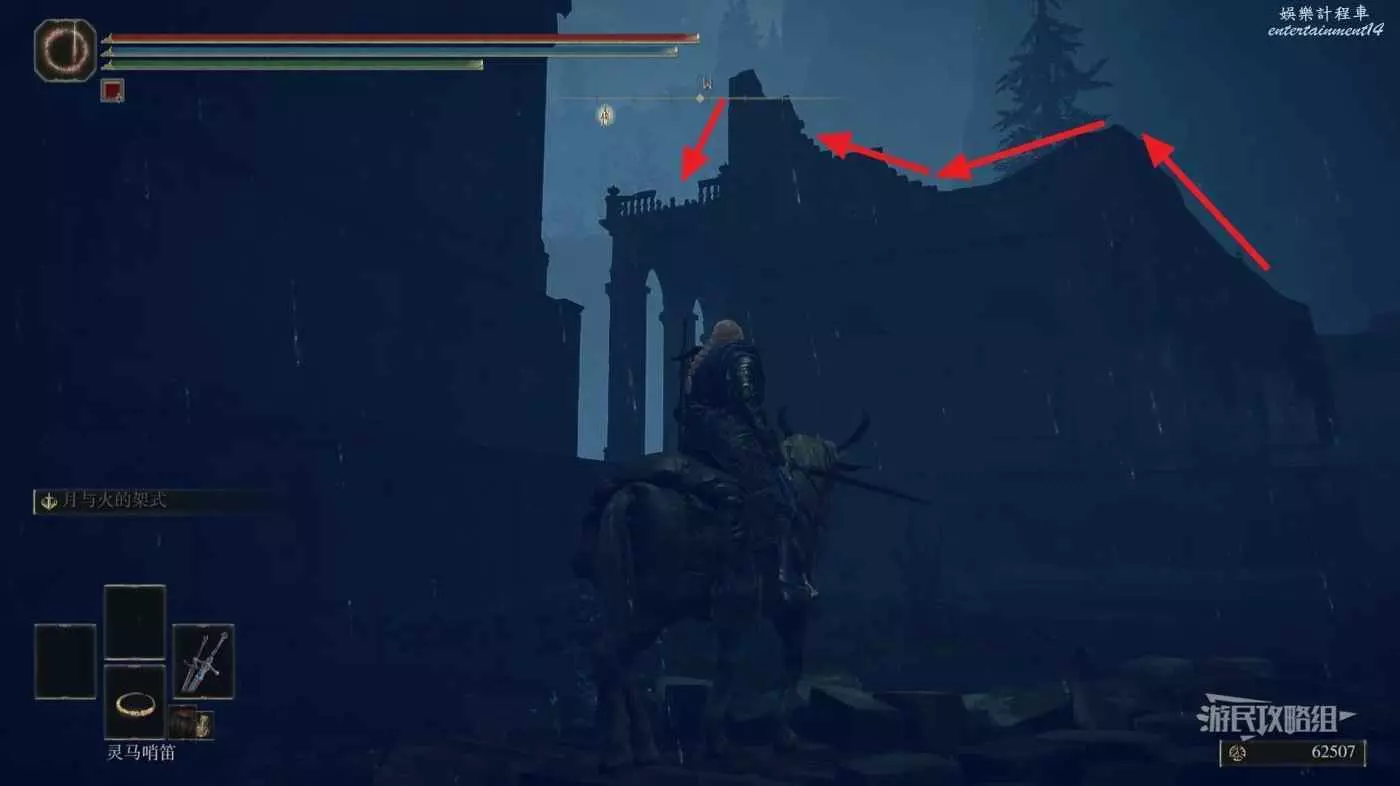 從幽影城下方賜福【城底積水處】出發,正前方安堤廢墟門前坐著一個巨大的燃爐魔像,利用旁邊較矮的廢墟騎馬跳到高處,向它頭頂的碗裡丟一個大燃爐壺即可啟動,擊敗獲得吸血破露滴。