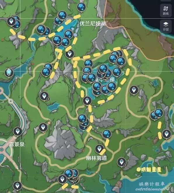 原神 (Genshin Impact) 湖光鈴蘭收集線路分享 26 6 月 2024-06-26 廣告 作者:玥靚星星 來源:米遊社論壇 主要生長在水邊,所以—— 從優蘭尼婭湖旁邊的錨點出發繞著湖跑一圈 然後來到湖中垂柳同樣繞著跑一圈,中間大柳樹附近也有哦! 最後來到幽林霧道左下角錨點的小河裡還有一些