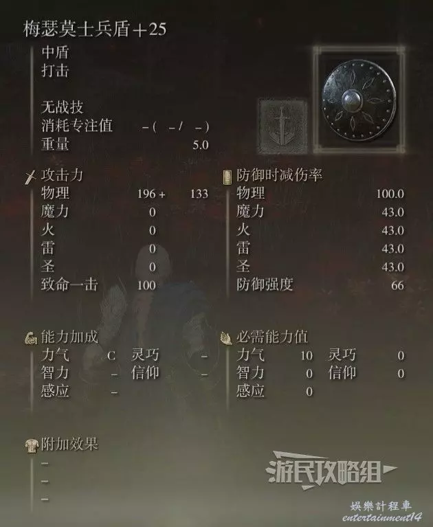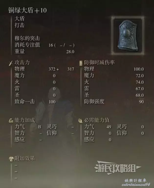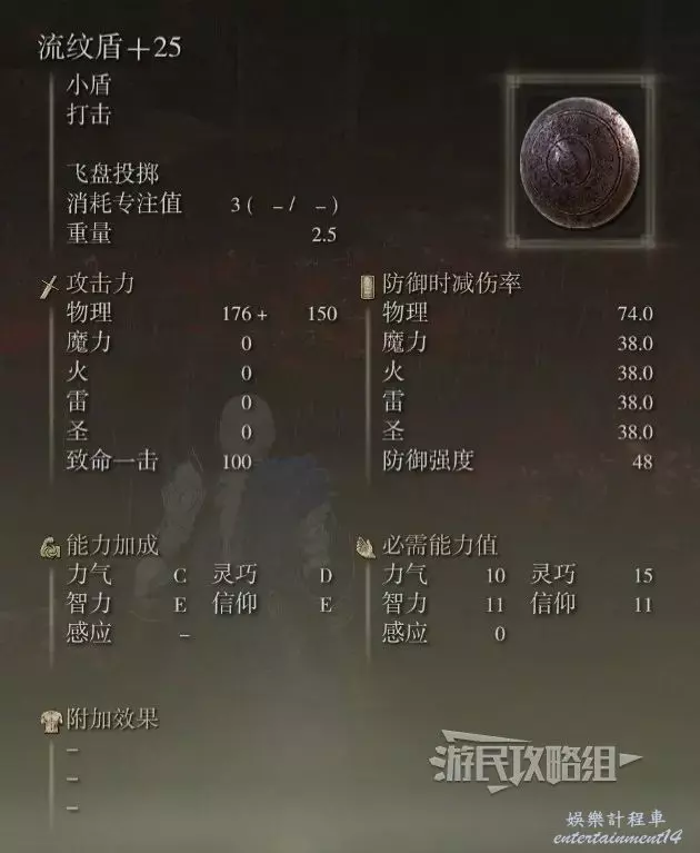 重量5,防護強度為54,比本篇中的藍金鳶形盾屬性要高一些。如果不想讓盾牌占太多負重的話,可以考慮使用。