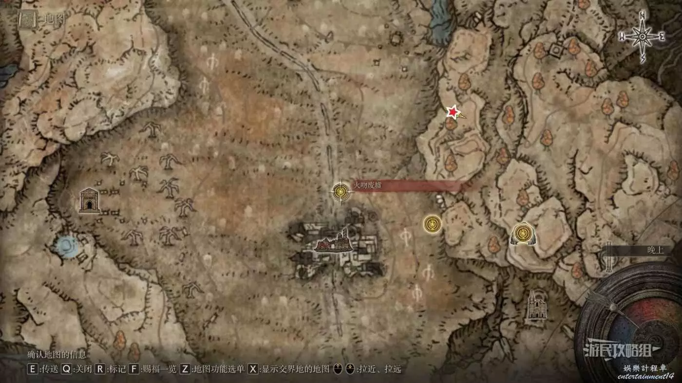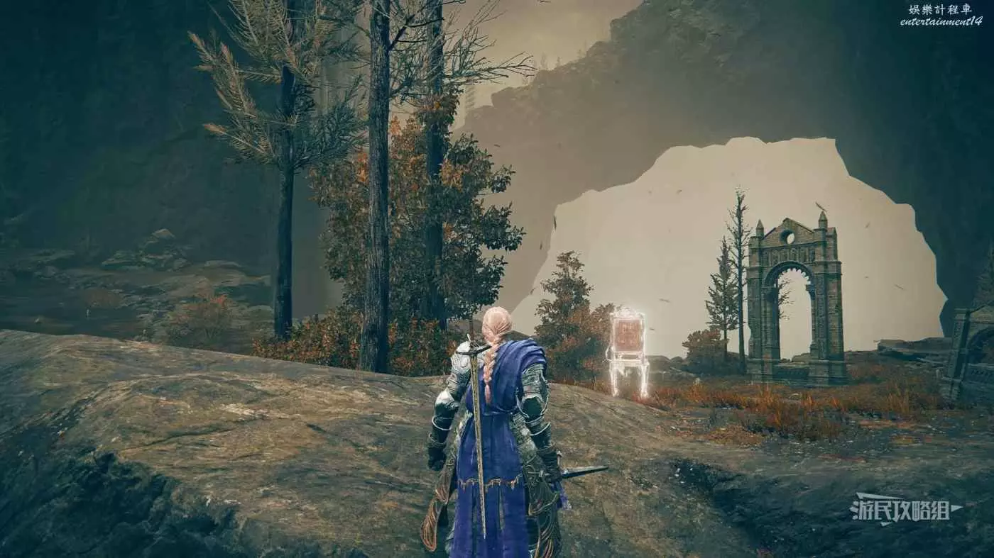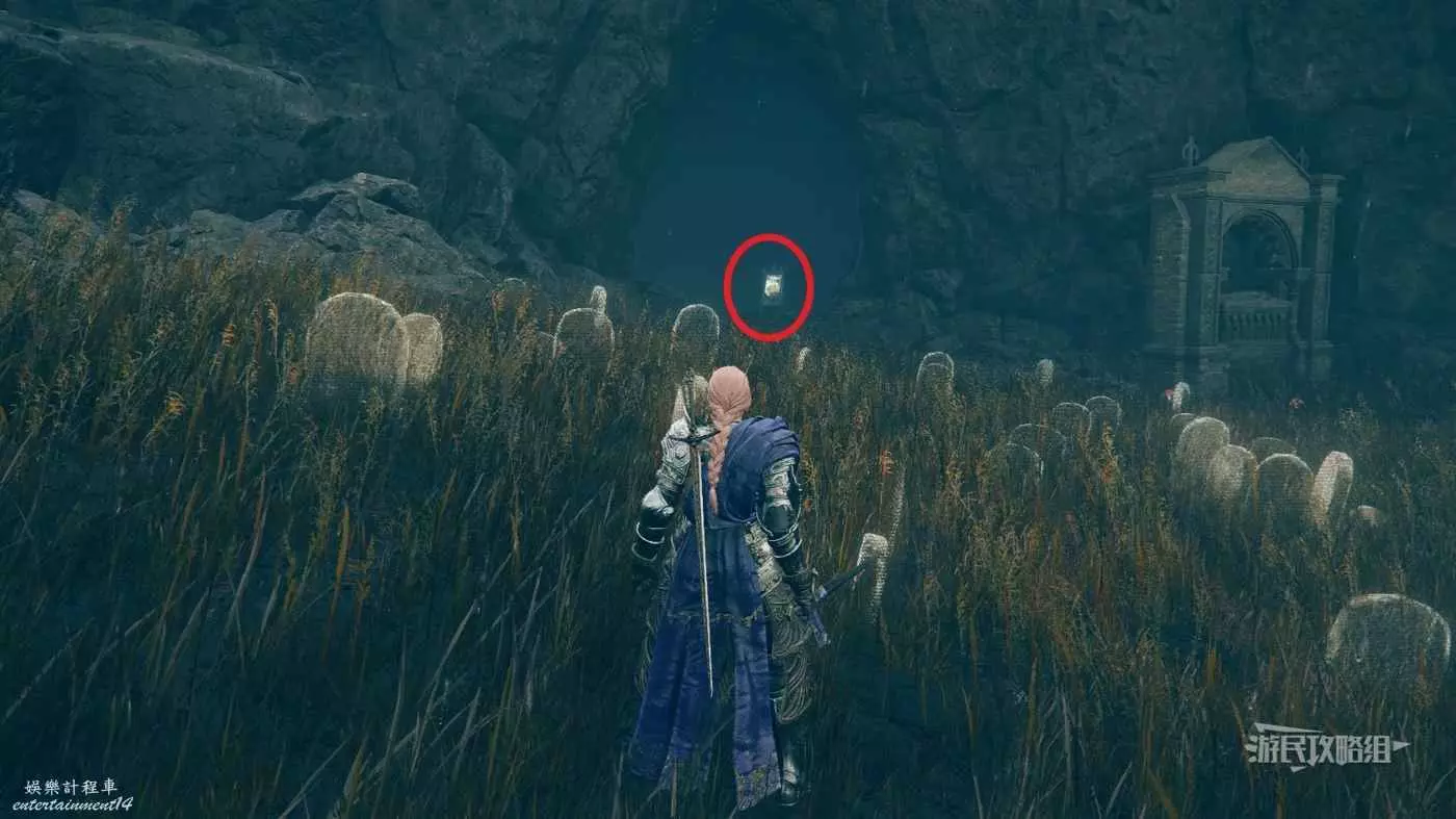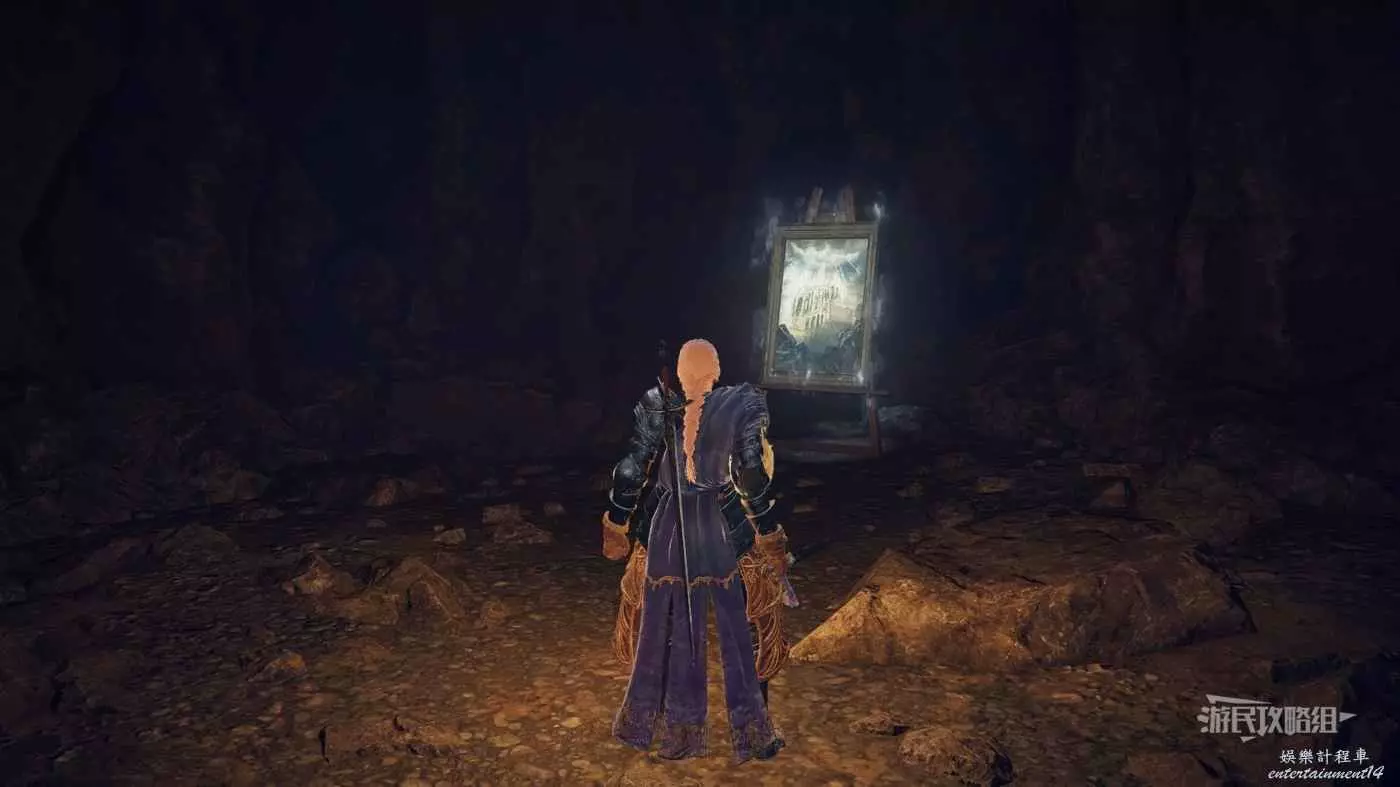 進入DLC後前期就能找到第一幅畫,從賜福【墓地平原】出發,往地圖東北方向走,可以看到北邊的賜福【火吻廢墟】。從賜福【火吻廢墟】往東北方向的岩壁下方走,貼著岩壁繼續走可以看到墓地和守墓鳥,路過墓地和守墓鳥之後即可在岩壁上看到一個洞穴,繪畫就在洞穴裡。