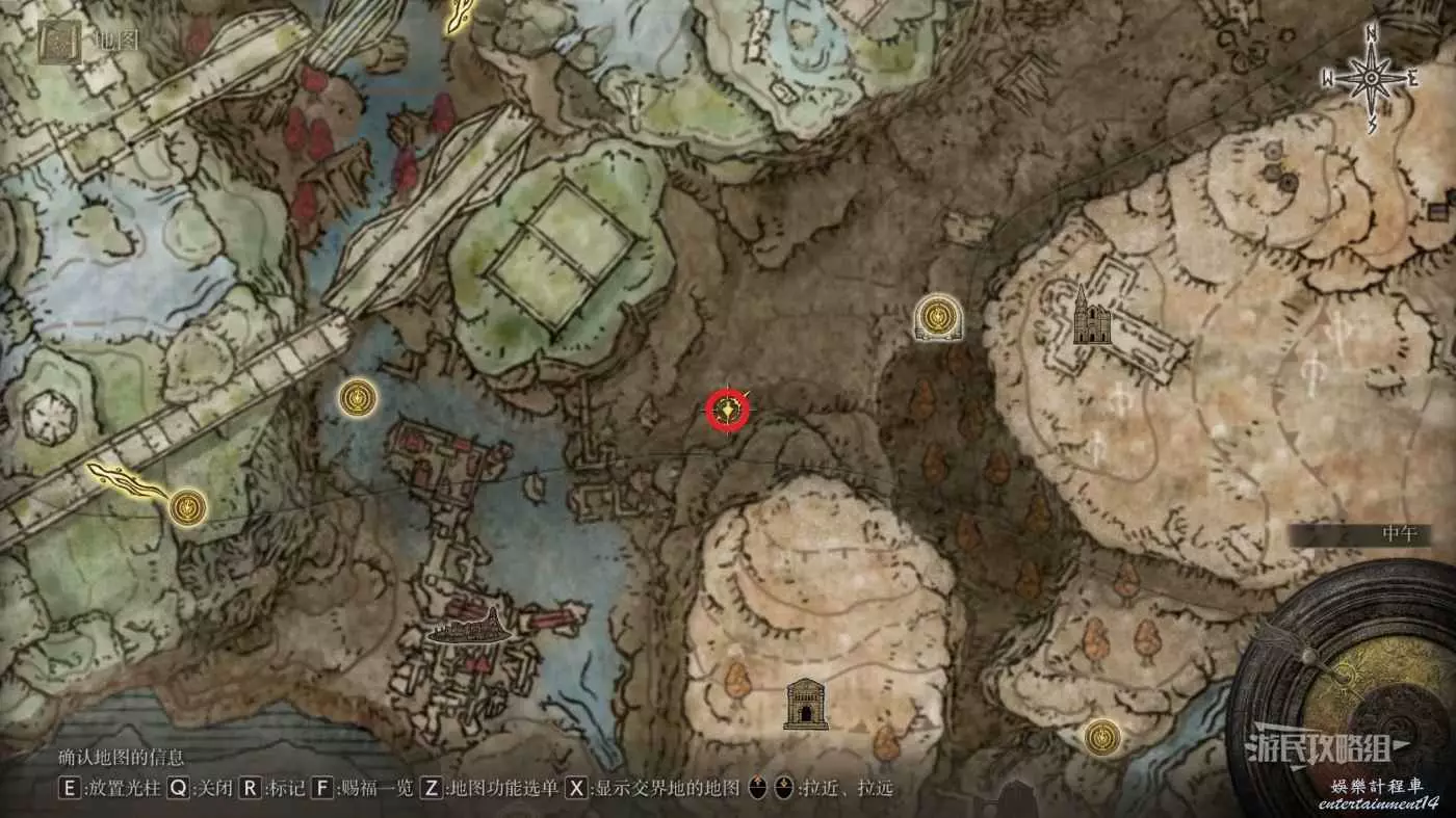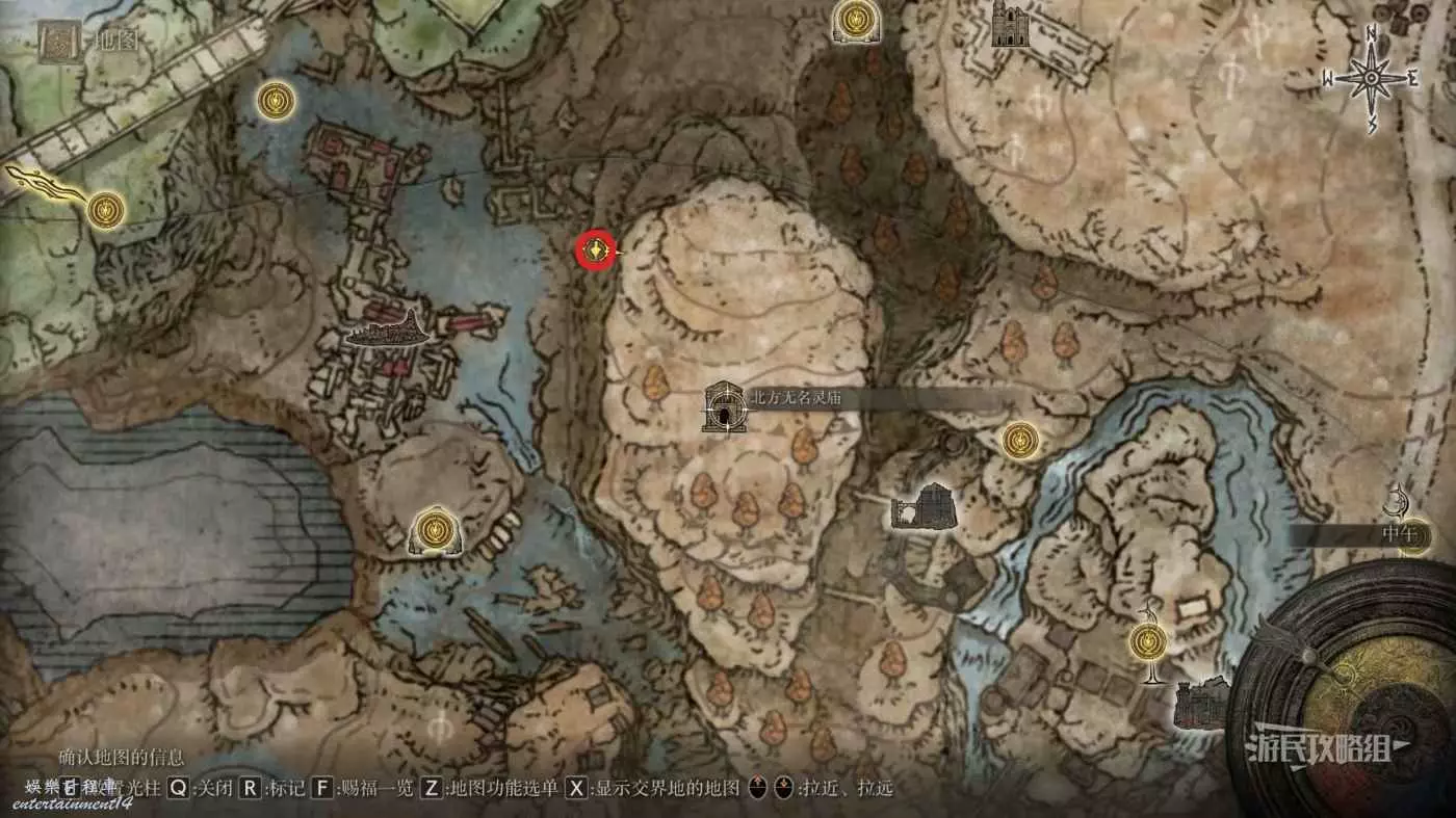 從墓地平原賜福【三叉口的十字記號】往西北方向走,到達一片湖區,在下圖標記所示的水邊往西南方向看,可以看到畫裡描繪的那座橋。前往畫家所在的位置需要沿著斜坡往西走,到岩石西北邊的三棵小樹所在位置就能看到畫家了。