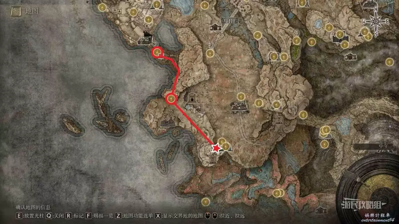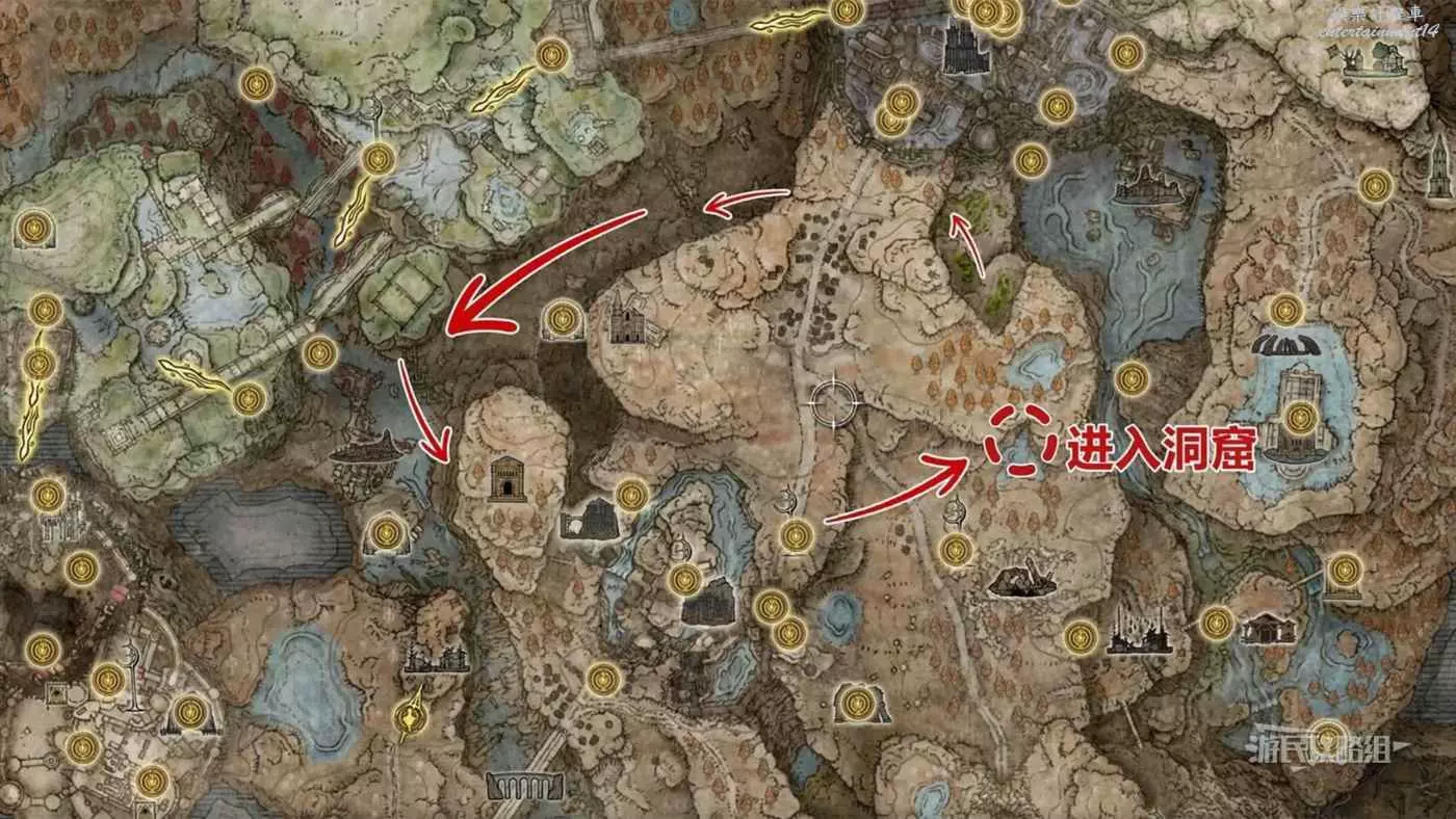 獎勵位置在墓地平原賜福【大橋北方】的東北邊,但是只有到幽影亞壇後才能前往,路線參考下方紅色箭頭指引,紅色虛線位置為洞窟。途中需要解開一處封印氣流,具體請參考下文。