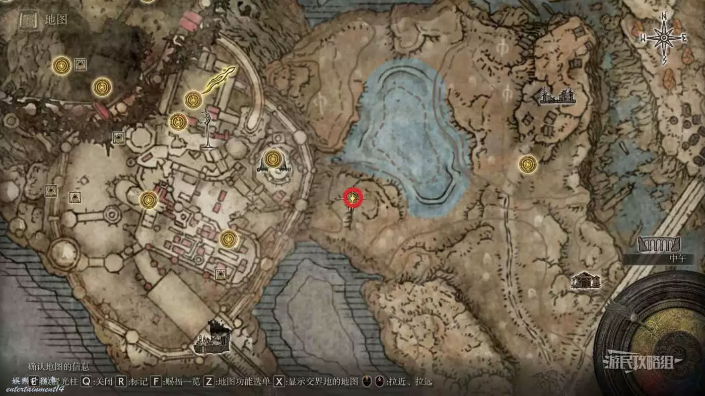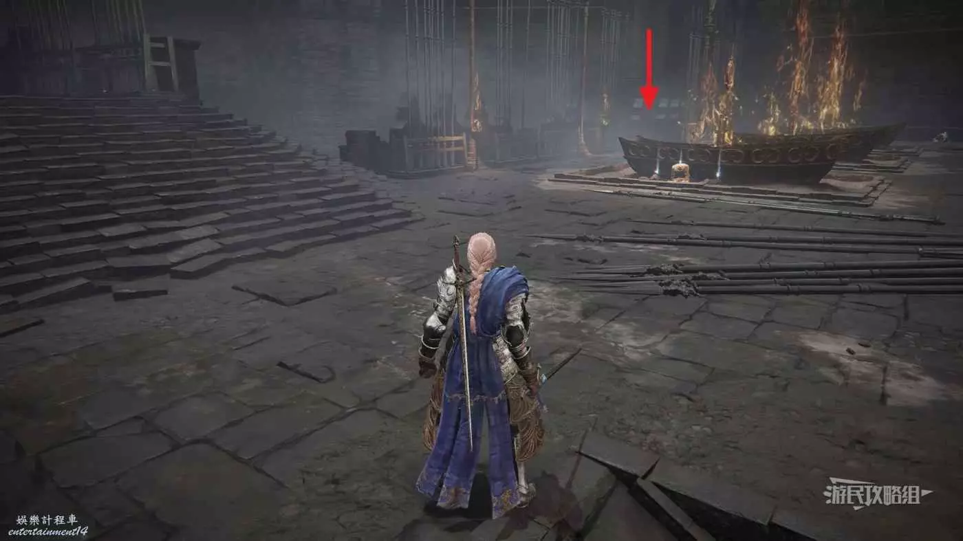 在幽影城內,擊敗黃金河馬並啟動賜福【正門廣場】後,往西北方向前進,來到城堡頂層可以看到一座很寬的橋,橋旁邊有著火的船。