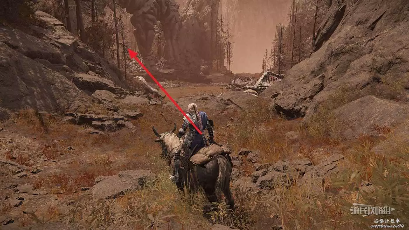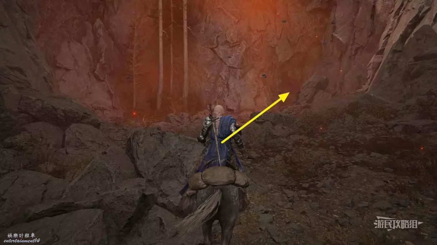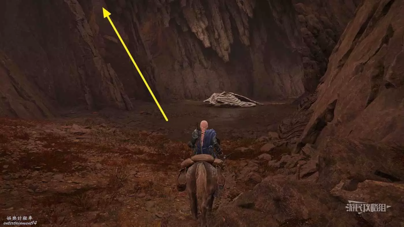 繼續沿著路前進,可以看到東北邊的。這裡的戰鬥可以跳過,直接穿過洞穴到達洞穴北部的陡坡(坡上有龍的屍體),繼續前進到達賜福【尖刺山(中段)】