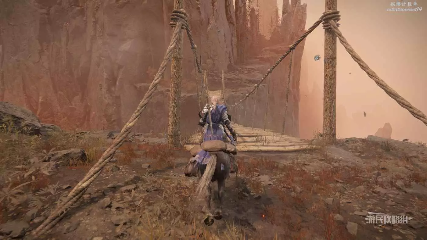 然後繼續沿著路往東偏南方向前進,在小路盡頭有一處氣流,利用氣流到達上層,繼續往東南方向轉彎,看到一座吊橋,穿過吊橋,到達賜福【尖刺山的山腳】。