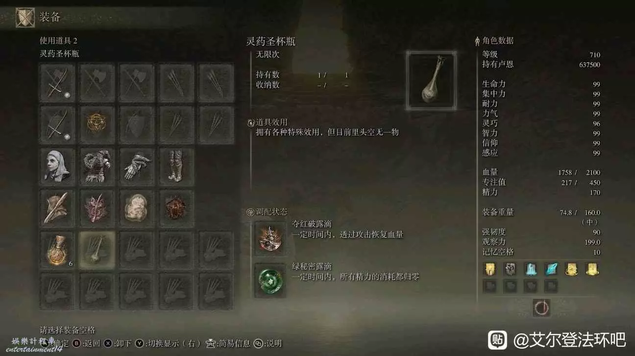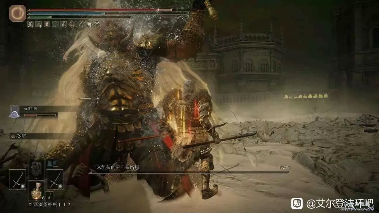 buff就常規的立誓和黑焰庇護。靈藥的話帶那個綠秘密和奪血破露滴。護符腐敗翼劍,血王歡愉,雙頭劍,還有最重要的神皮繈褓。大盧恩用女武神的。我藍條拉滿了就沒帶回藍,全帶瓶血。門口上buff捏大盧恩,然後雙持左手放誇耀咆哮。進門立馬喝靈藥然後翻滾躲過拉塔恩的毒龍鑽,然後回身開忍耐,一般十字刀的常用攻擊就是按左肩鍵捅三下,然後繼續忍耐,迴圈幾次就到二階段。到了二階段最重要的是站擼的時候如果挨打了血量下了直接開忍耐然後喝血瓶接著跟他對掏,不要慌了就跑路亂躲啥的,不過他的大荒星隕最好躲一下,如果硬接怕他後手太快直接帶走,大概就這些。