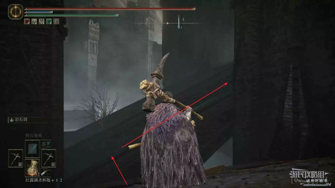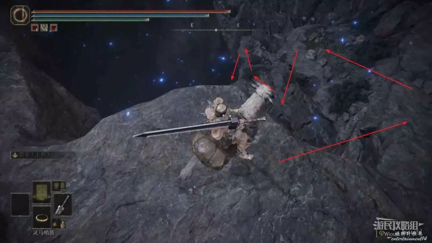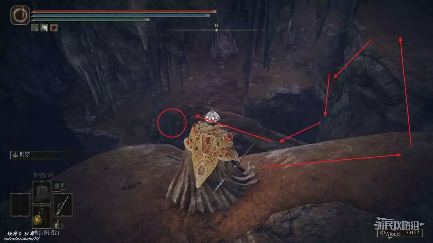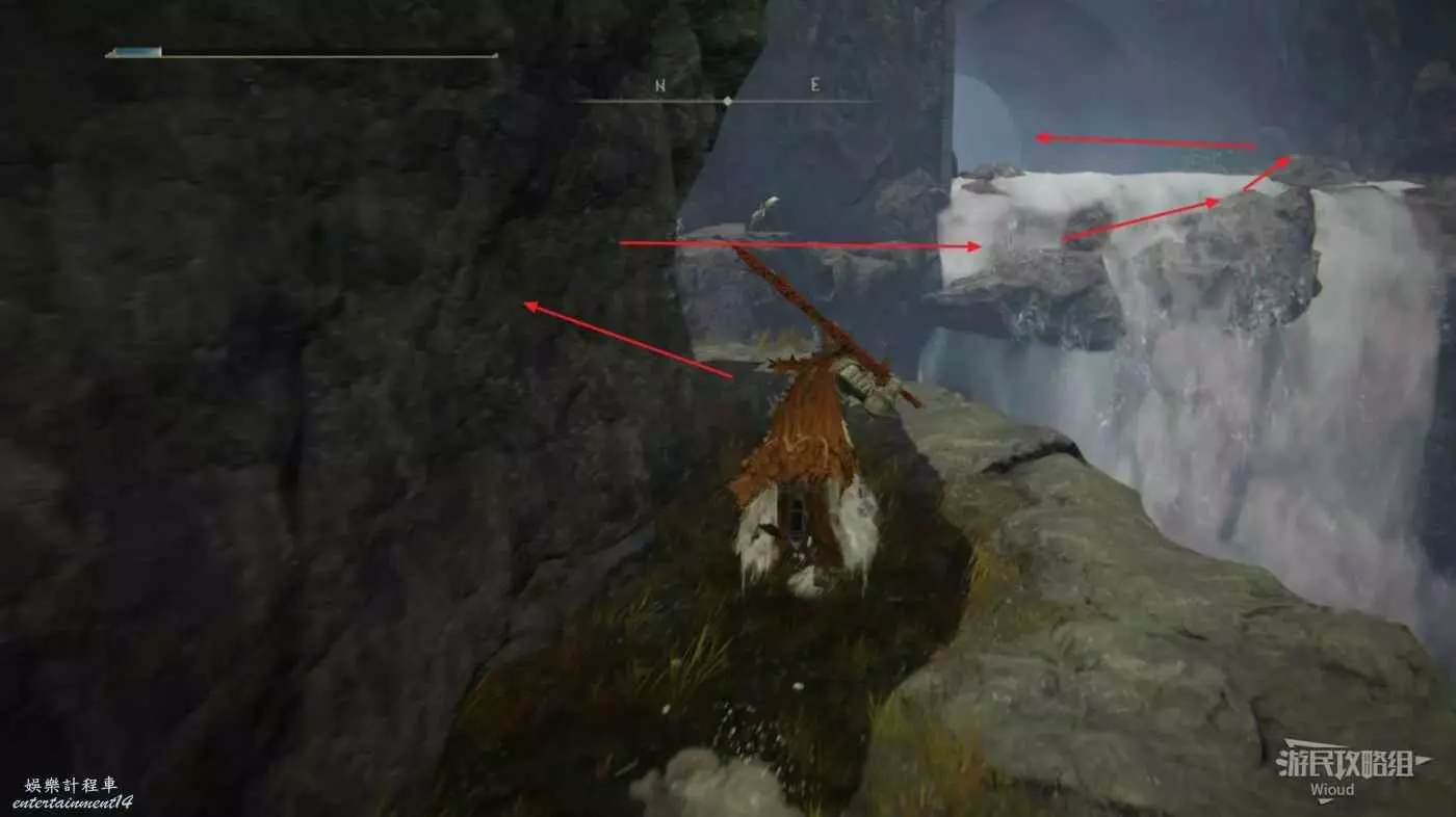 然後從賜福【大洞中段】開始,先往方位輪盤的N-E的朝向走到懸崖邊,我們一會需要從右前方的石塊處跳下去,沿著下方的石橋走到左側畫圈岩石柱的位置,此處可以撿到魔法【融泥塊】。