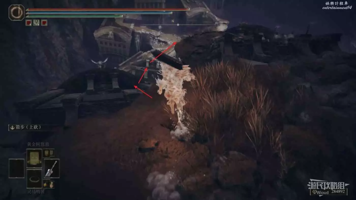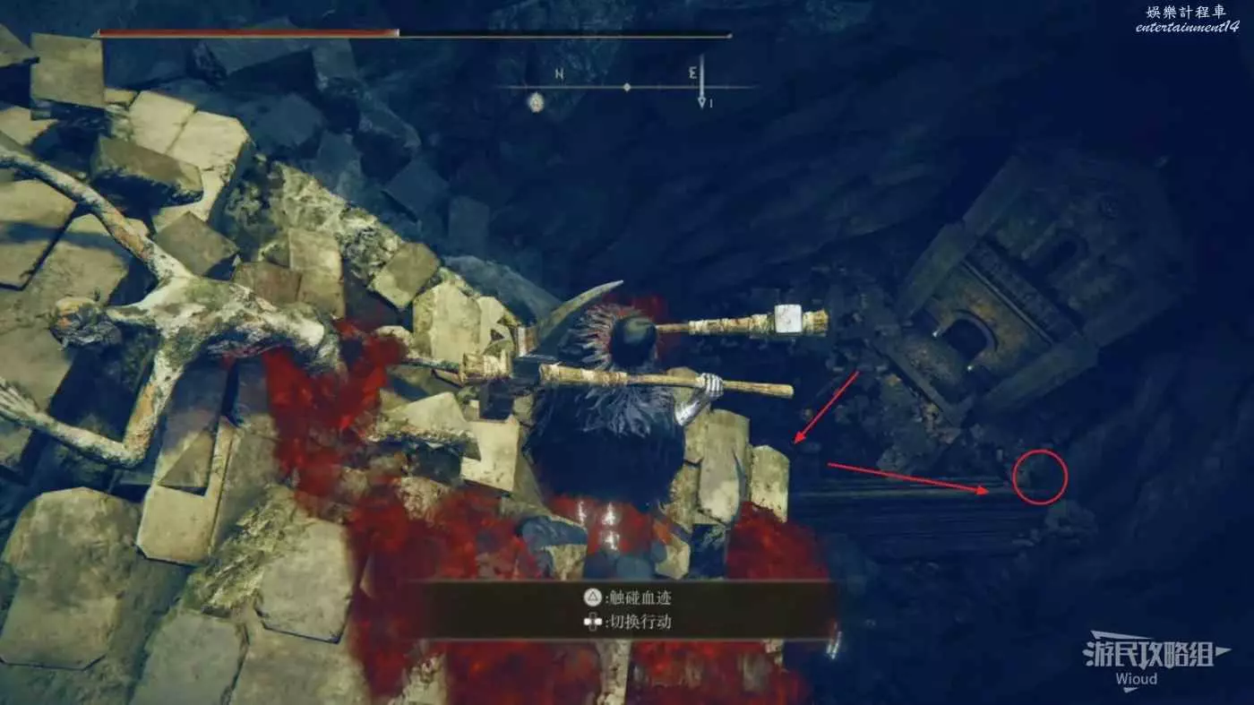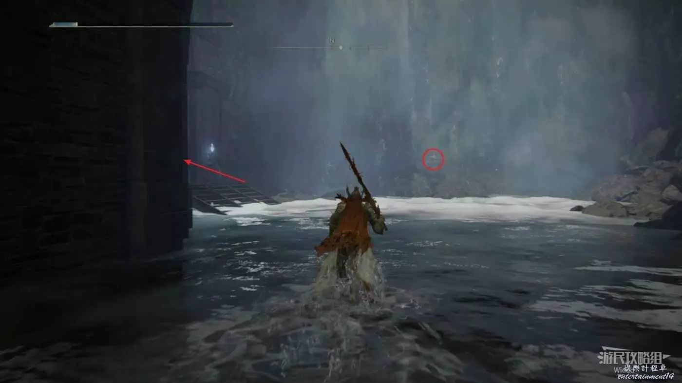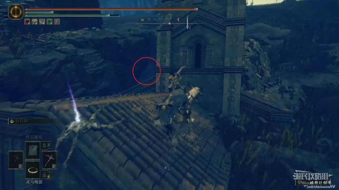 然後從賜福【大洞中段】開始,先往方位輪盤的N-E的朝向走到懸崖邊,我們一會需要從右前方的石塊處跳下去,沿著下方的石橋走到左側畫圈岩石柱的位置,此處可以撿到魔法【融泥塊】。