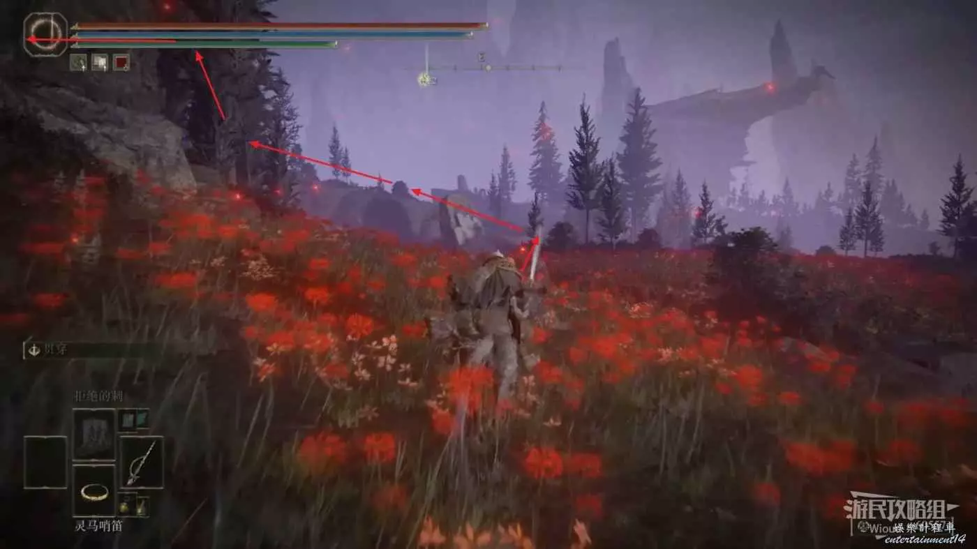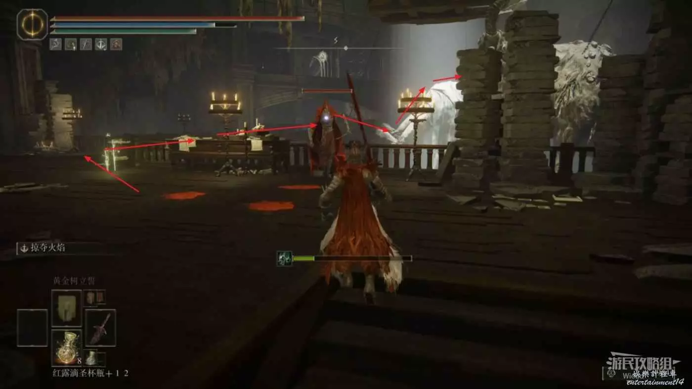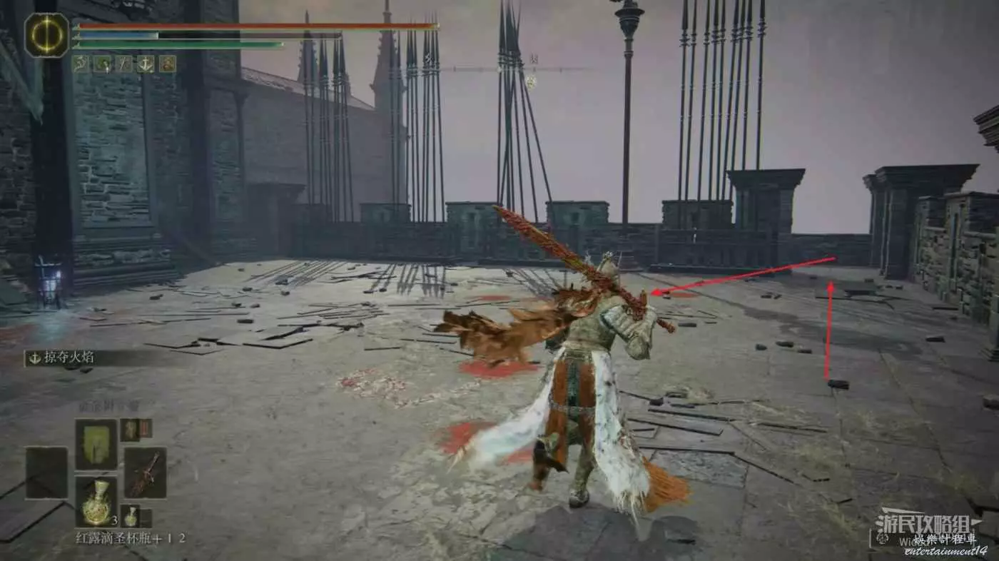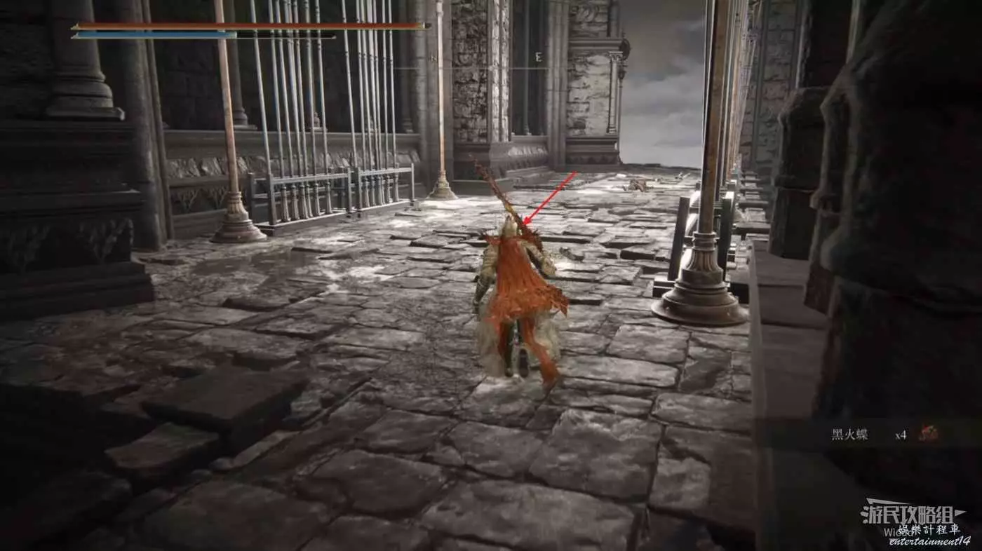 爬上第一段樓梯後可以發現,對面高處有一個火焰騎士會不斷使用魔法攻擊我們,注意躲避傷害,剛走出樓梯直接被幹掉一管血很傷。