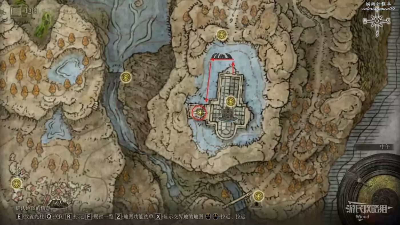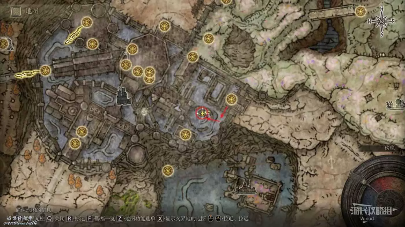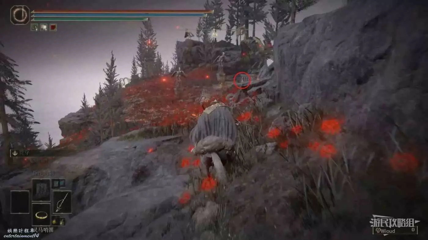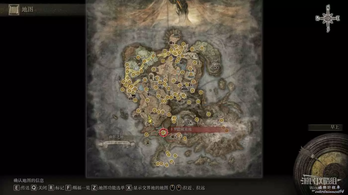 傳送到賜福【卡羅隱藏墓地】後往方向輪盤E的朝向走,然後繞著前面的坡往左走。