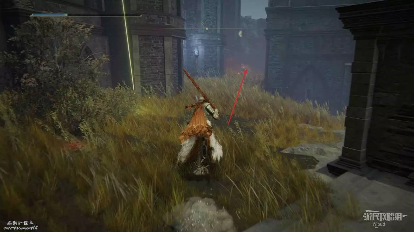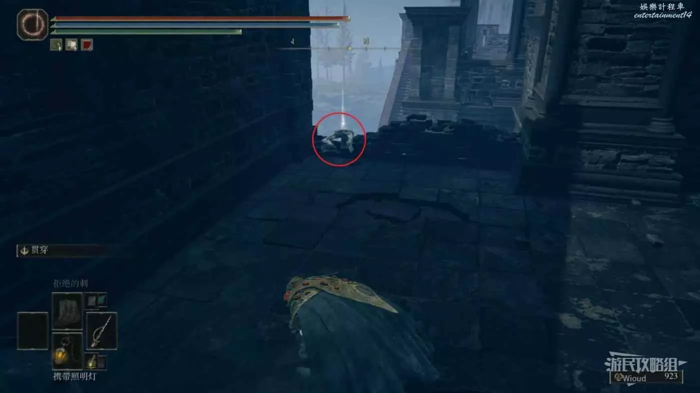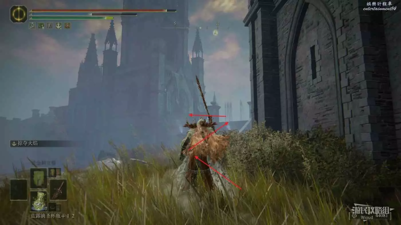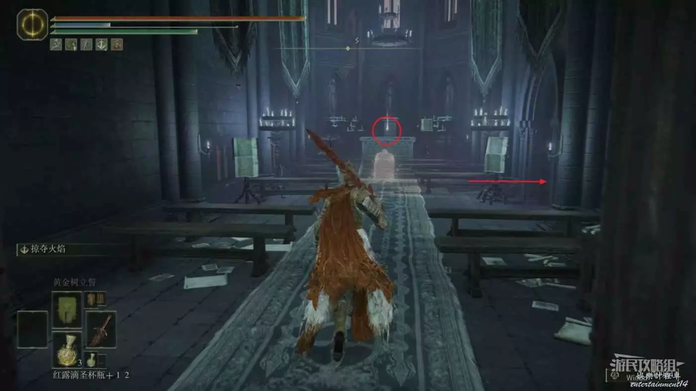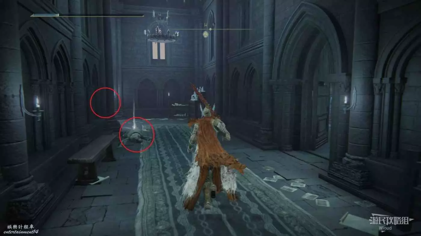 隨後回到城堡門前,此處有大門和小門兩個入口,從哪進入都一樣,走到城堡一個類似教堂的建築後拾取前方的道具可以獲得護符【蕾菈娜的浮雕墜飾】。