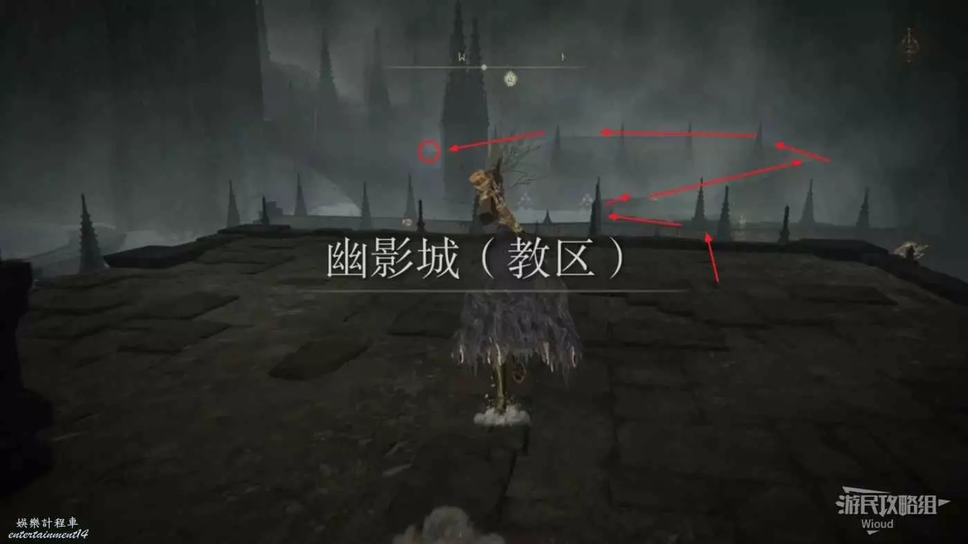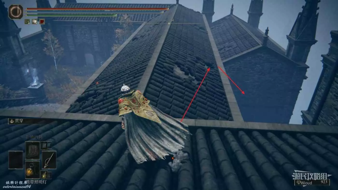 在教區入口直接跳房子,先沿著下圖所示路線跳到前方左側的房頂上。