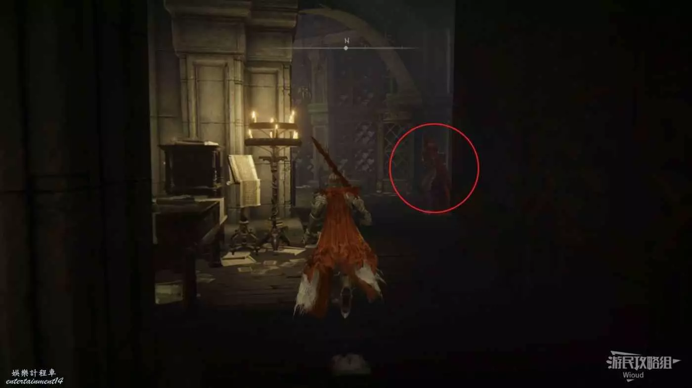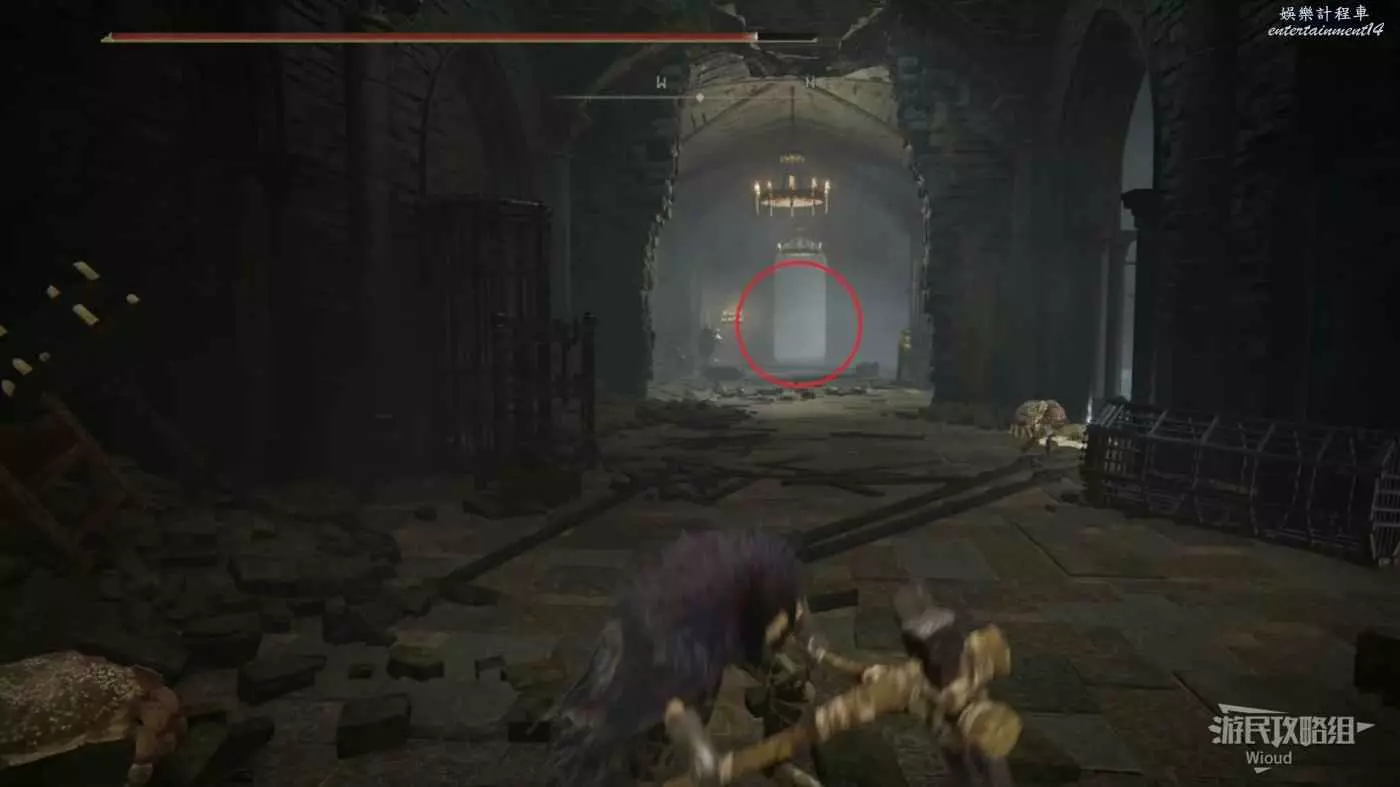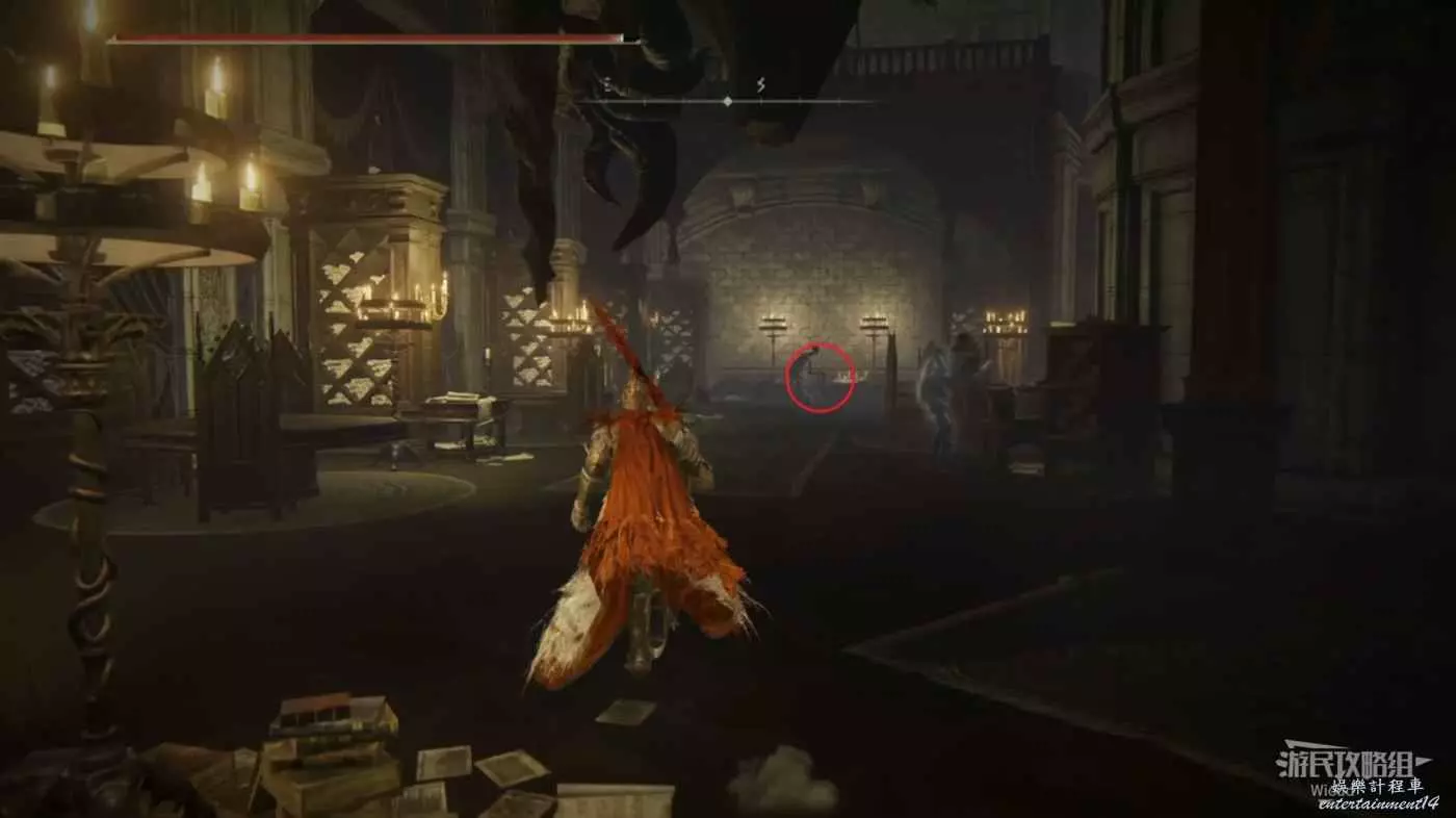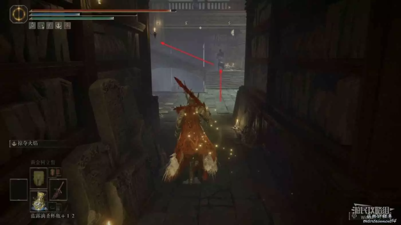 擊敗此處的火焰騎士並爬上第二段樓梯後可以發現前方左下角有一個往下走的樓梯。